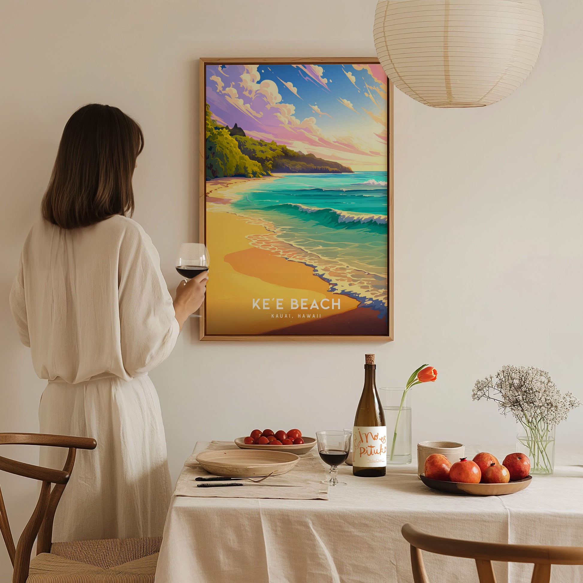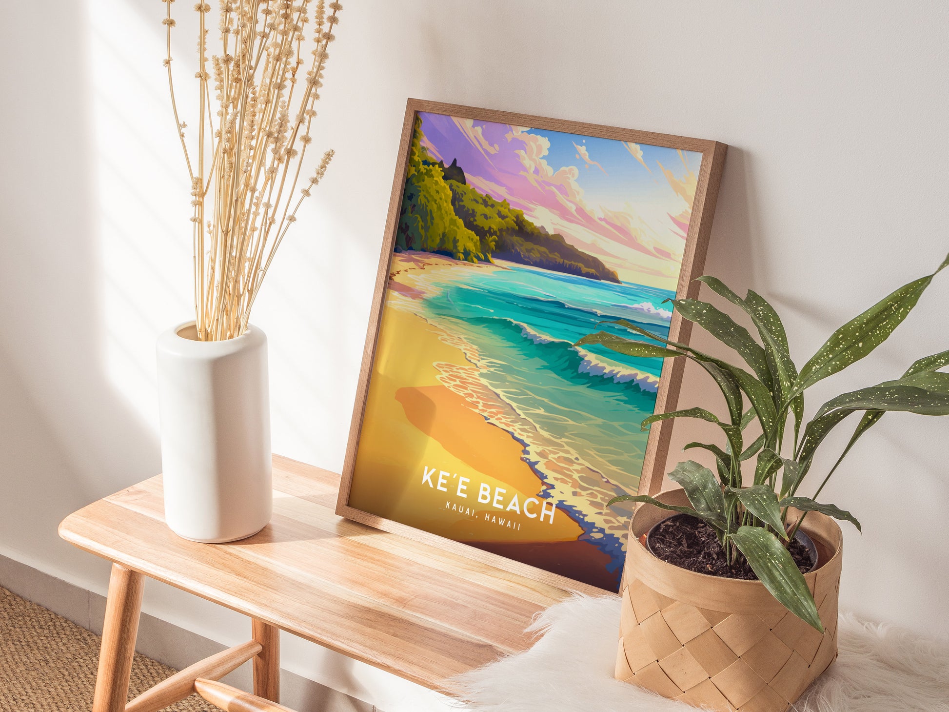 ハワイで最も美しい海岸線のひとつを垣間見ることができるこのケエ ビーチのプリントで、ガーデン アイランドの静かな端を祝いましょう。