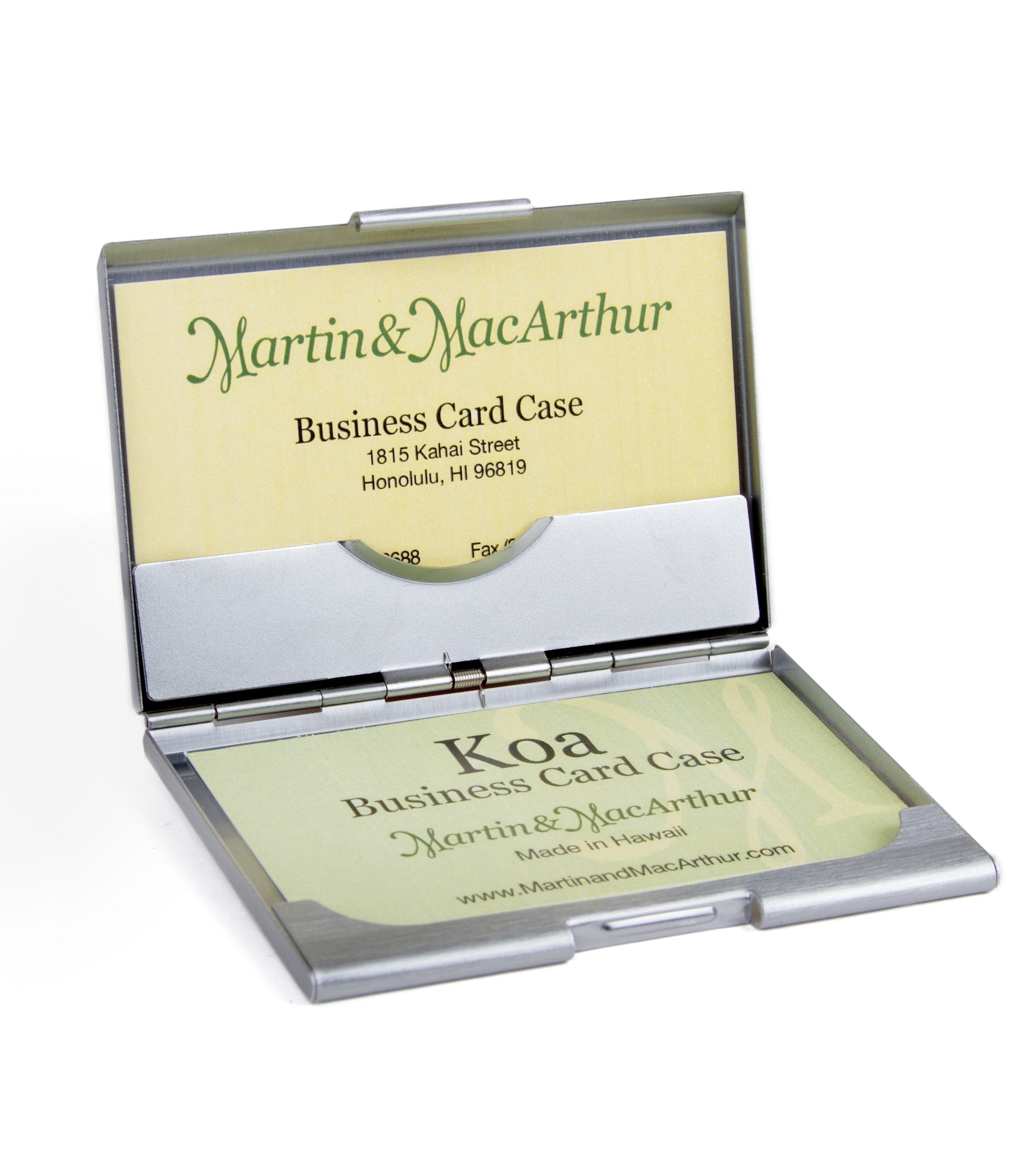 このエレガントな名刺ケースは、コア材のベニヤ板と2つのカードホルダーが特徴です。コア材はハワイ諸島原産で、昔のハワイではカヌー、武器、家具の材料として広く使われていました。1800年代にハワイに定住した宣教師や商人たちは、その美しい光沢のある木目と質感にすぐに魅了されました。Martin & MacArthurの職人たちは、ハワイ州ホノルルにある工房で、このコア材の名刺ケースを丁寧に仕上げています。