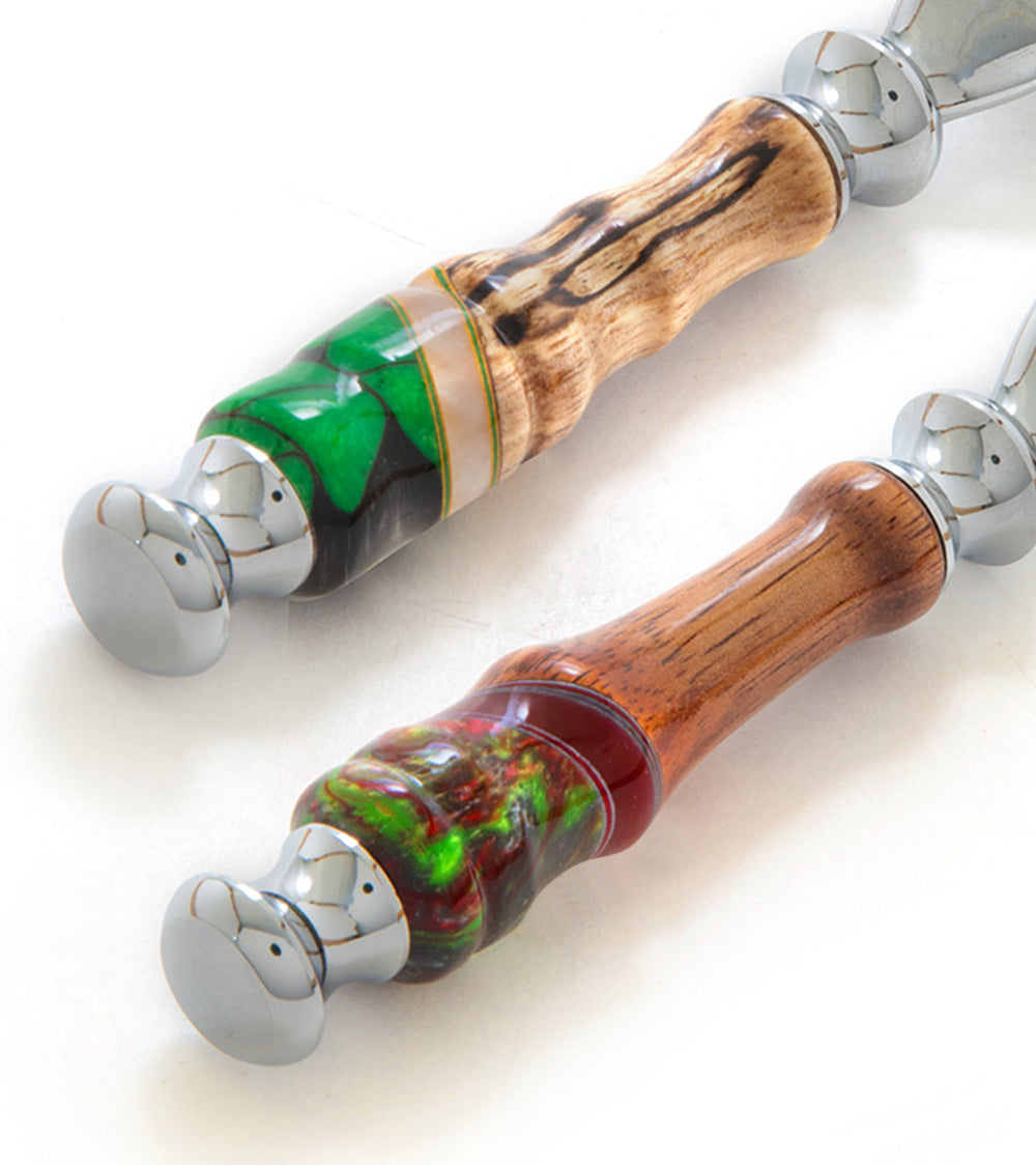 デールは、手のひらで楽に握れるよう、精密なバランスで輪郭を描いたカミソリのバレルを製造しています。当社のカミソリには、木材の防水性を高めるため、高級マリンニスを塗布しています。