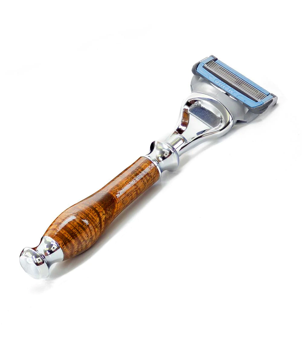 ハワイの職人たちが、厳選したビッグアイランド・コア材を使用し、無垢のコア材カミソリをデザイン・製作しています。コア材のハンドルは、熟練の職人メルが一つ一つ旋盤で丁寧に仕上げています。彼は、手のひらに優しくフィットする、絶妙なバランスのカミソリの胴体を作り上げます。木材の防水性を高めるため、カミソリには高級マリンニスを塗布しています。