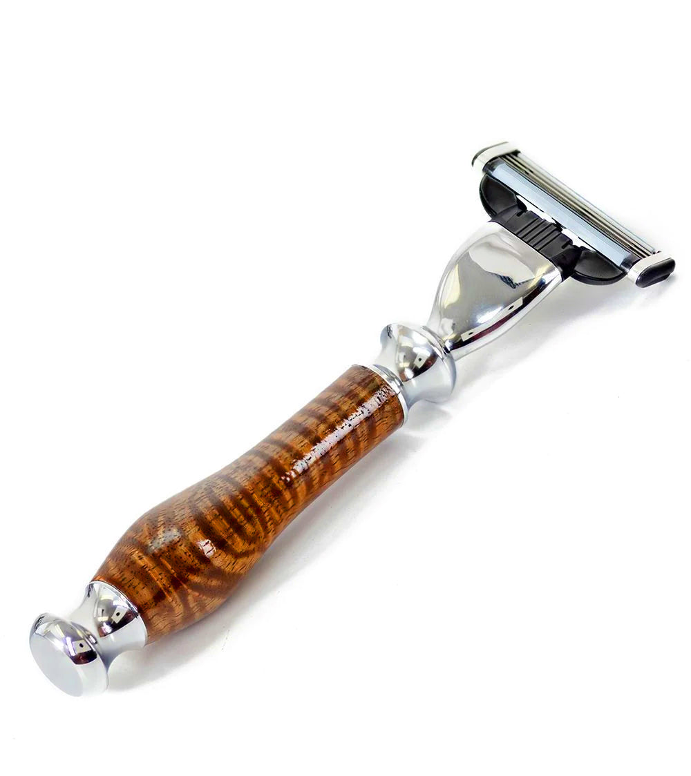 ハワイの職人たちが、厳選したビッグアイランド・コア材を使用し、無垢のコア材カミソリをデザイン・製作しています。コア材のハンドルは、熟練の職人メルが一つ一つ旋盤で丁寧に仕上げています。彼は、手のひらに優しくフィットする、絶妙なバランスのカミソリの胴体を作り上げます。木材の防水性を高めるため、カミソリには高級マリンニスを塗布しています。