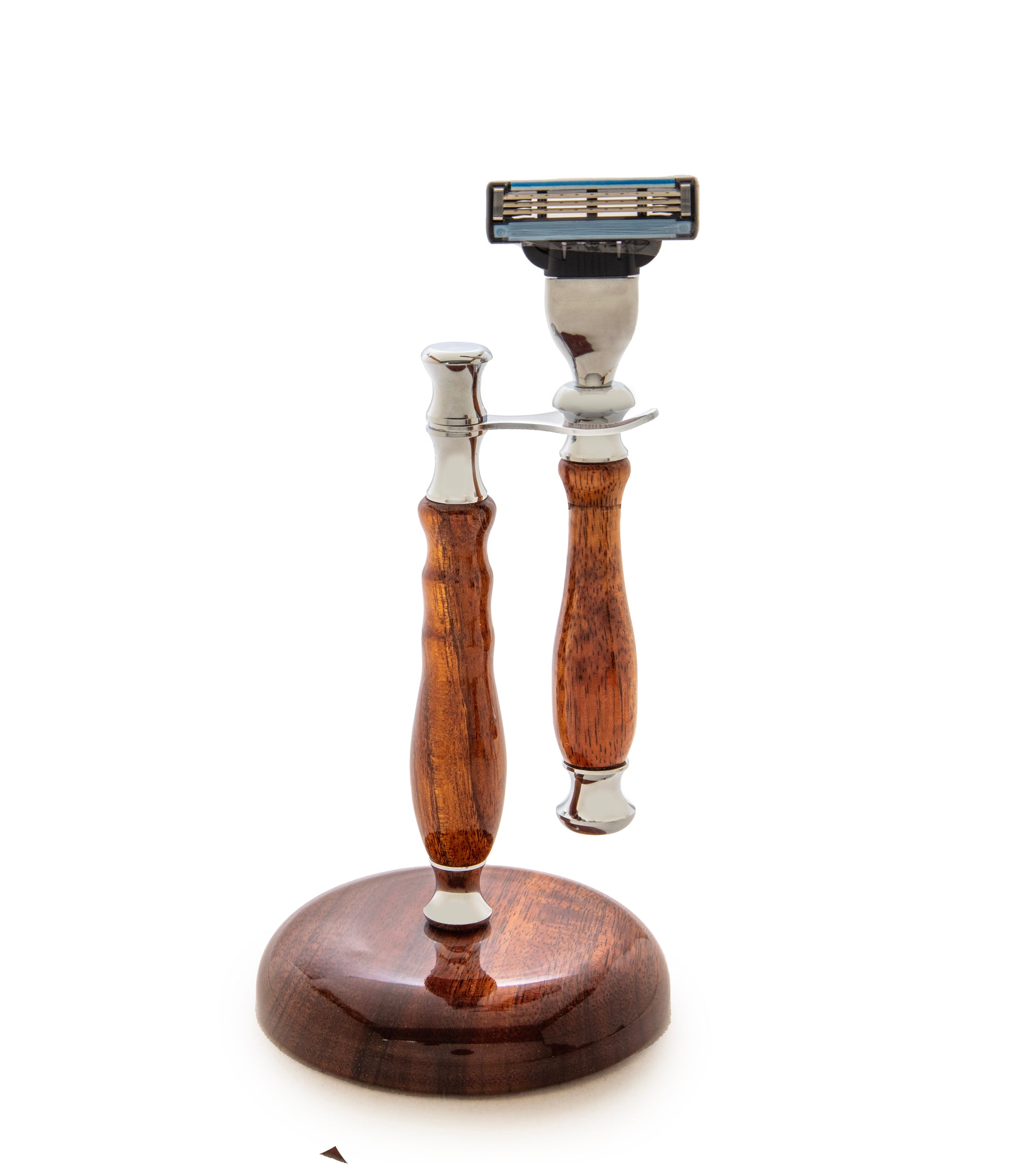 ハワイの職人たちが、厳選したビッグアイランド・コア材を使用し、無垢のコア材カミソリをデザイン・製作しています。コア材のハンドルは、熟練の職人メルが一つ一つ旋盤で丁寧に仕上げています。彼は、手のひらに優しくフィットする、絶妙なバランスのカミソリの胴体を作り上げます。木材の防水性を高めるため、カミソリには高級マリンニスを塗布しています。