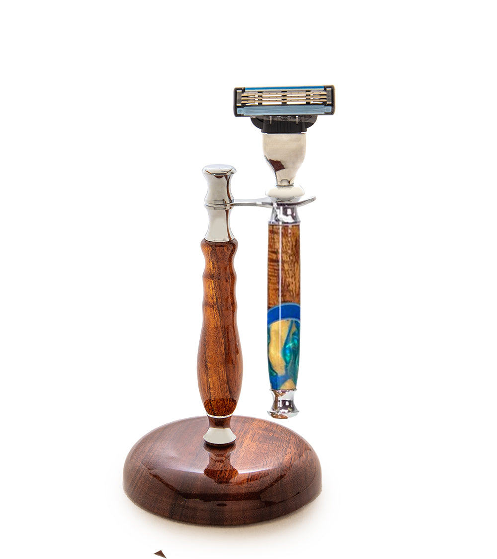 退役米海軍のデール・デニソン氏が、美しいコア材のパーソナルアクセサリーをはじめとする素晴らしい作品を制作してくださったことを光栄に思います。デール氏は、ハワイ島産のカーリーコア材のプライベートストックに、鮮やかな色の樹脂と半貴石を組み合わせています。作品はどれも個性的で、唯一無二の逸品です。デール氏は、コア材本来の自然な色合いを際立たせる着色樹脂の使用にこだわっています。