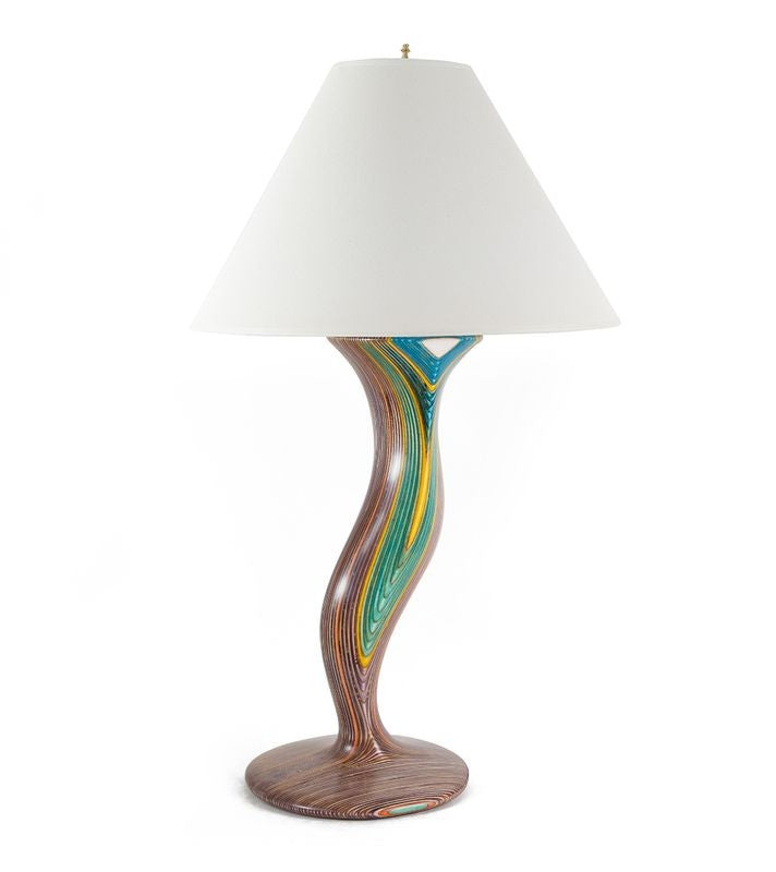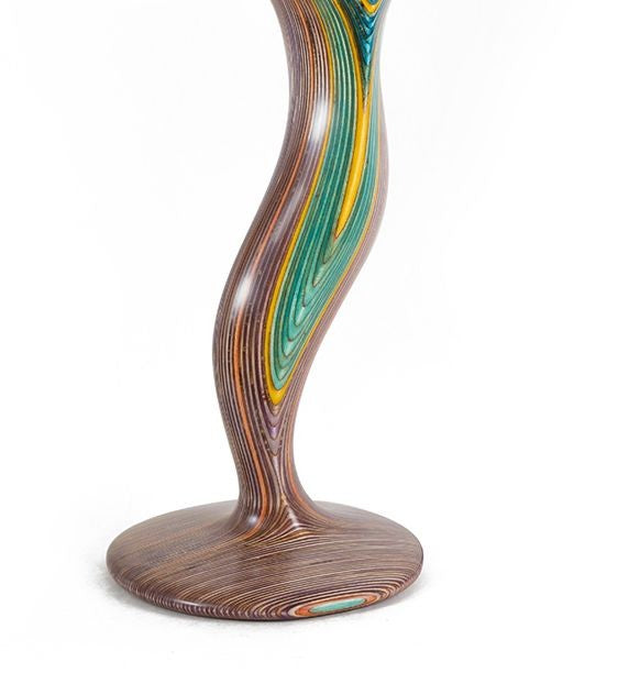 Rockは、アフリカ産のオベチー、イタリア産のメープル、フィンランド産のバーチなど、世界中から厳選された最高級のエキゾチックな木材から素材を選びます。これらの美しい木材の薄い層は、皮を剥がされ、乾燥され、時には2種類以上の対照的な顔料で着色されます。そして、これらの要素が、色と木目の層を交互に重ね合わせます。Rockは、それぞれのデザインを手作業で彫刻し、形と色彩のしなやかな模様を浮かび上がらせます。最後に、10回以上の保護塗装を施して作品を完成させます。