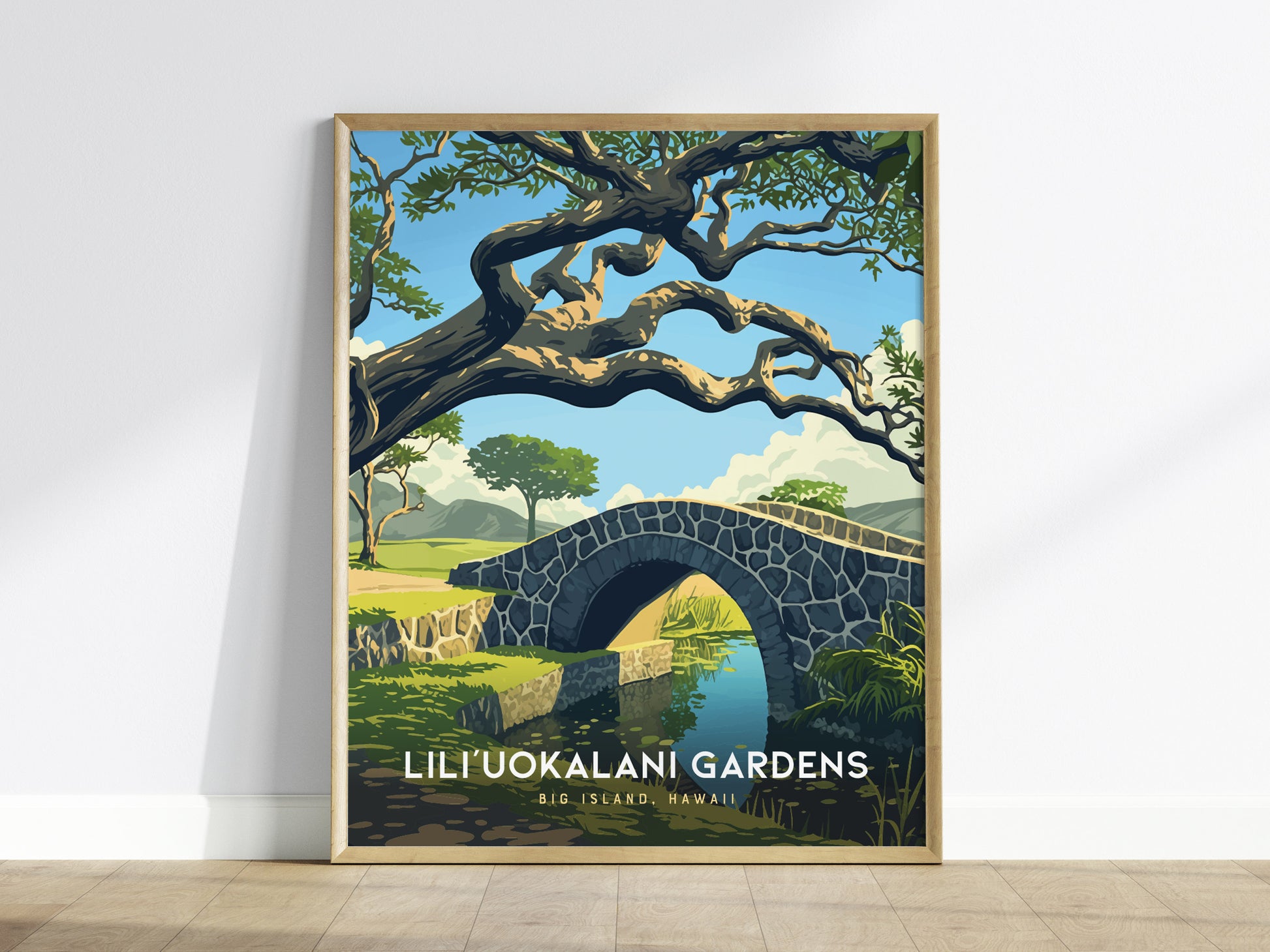 絵のように美しいハワイ島に位置する、日本国外では最大級の本格的な日本庭園、リリウオカラニ庭園を描いたこの魅力的なポスターで、その静謐な美しさに浸りましょう。このポスターは、丹念に手入れされた庭園と水面に映る水面が織りなす、心安らぐ雰囲気を、ご自宅やオフィスにもたらします。