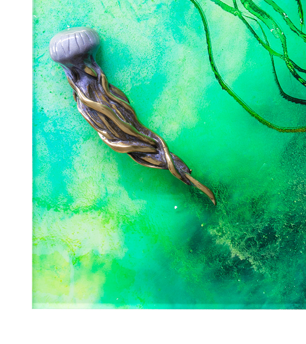 Serafin discovered a long-forgotten art form – reverse painting on glass. This200-year-old technique requires a deep understanding of composition. Using glassas his canvas, Serafin paints with his fingers and pallet knives, applying layer uponlayer to the glass. This takes several weeks, because each layer must dry beforeapplying different colors in the next layer. Once the layering process is complete, Serafin carves-out his sea creatures down to glass. Then he applies gold, silver and copper leafing to create a “shimmer” like the scales of a fish. The result is stunning.