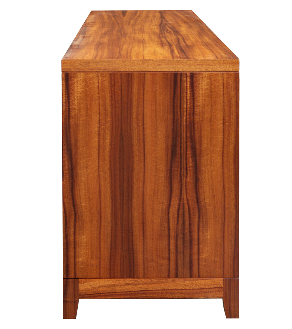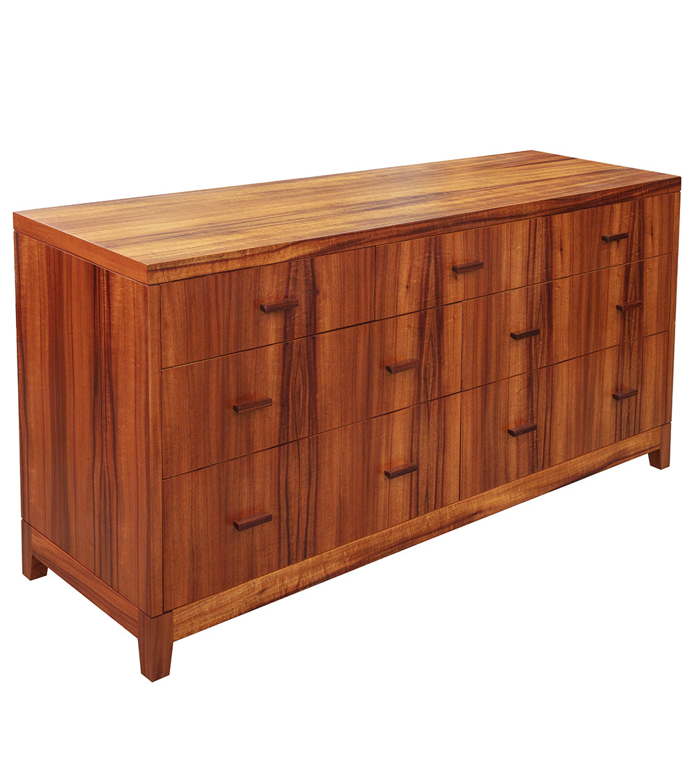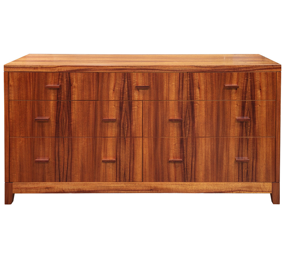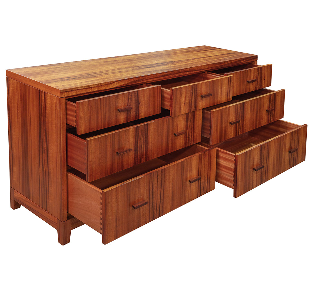 当社の家具職人が、7つの引き出しを備えたこの美しいモアナ ドレッサーを設計し、製作しました。モアナ コレクションは、美しいディテールと精巧な職人技を称える現代的な姿勢を反映することを目的としています。さらに、このデザインはすっきりとシンプルで、邪魔にならず、明快です。このドレッサーの深い7つの引き出しには、フルエクステンションの隠しスライドが付いているため、引き出しを伸ばしても機械部分が見えません。さらに、私たちは最先端の引き出しハードウェアにこだわり、自動的に静かに閉まり、非常に安定した一貫したフラッシュフロントを実現しています。このドレッサーには、温かみと優雅さを放つ、杢目の美しいカーリーコアを選びました。もちろん、当社の優れた職人によってハワイで作られています。ハワイ島で伐採され、当社のチームが手作業で厳選したコアを使用しています。結局のところ、それは単なるコアではなく、入手可能な最高級のコアなのです。