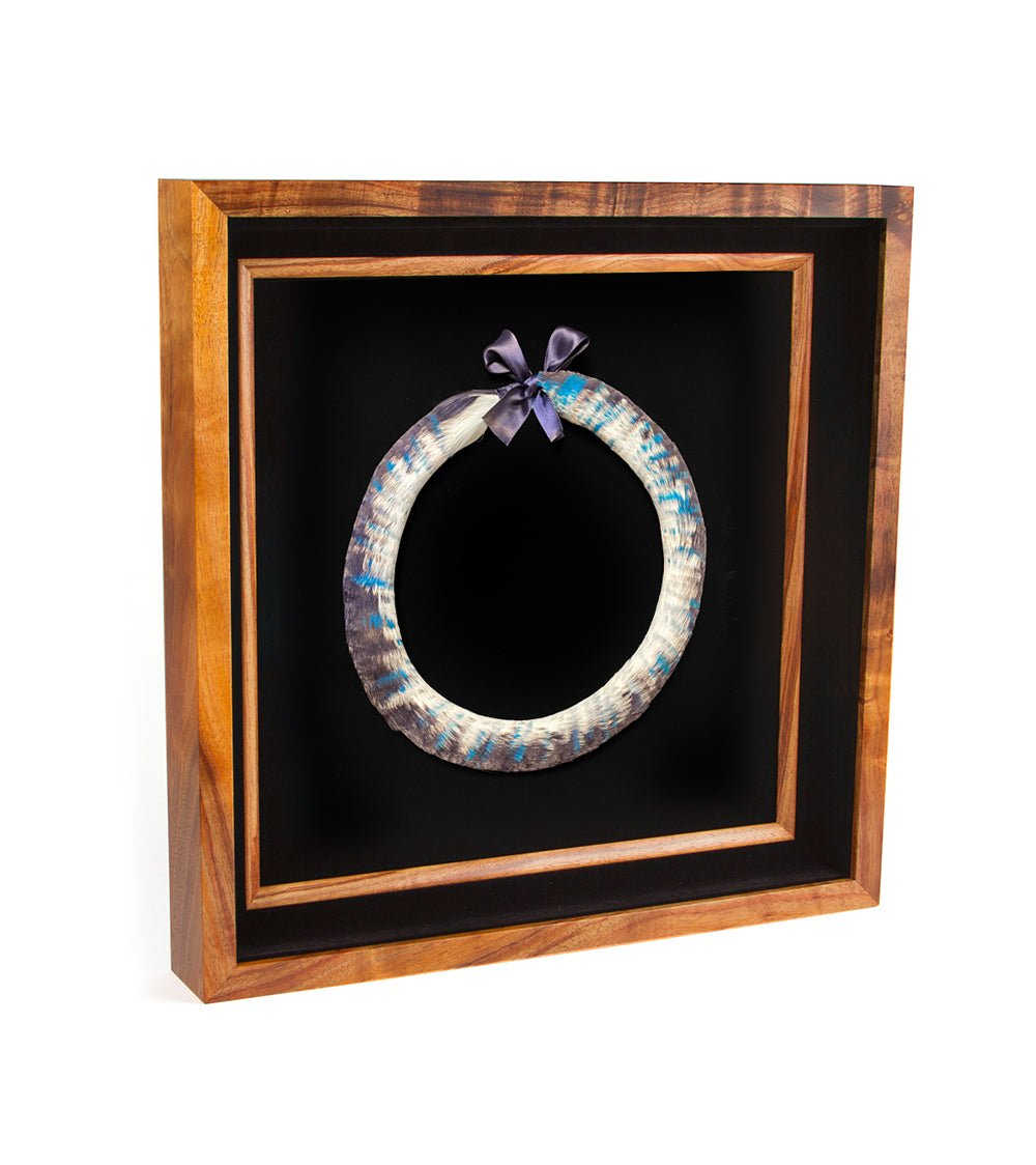 Martin & MacArthurのコア材シャドーボックスに額装されています。ご自宅やオフィスに最適なフェザーレイです。在庫切れの場合は、製作に6~8週間ほどかかります。
