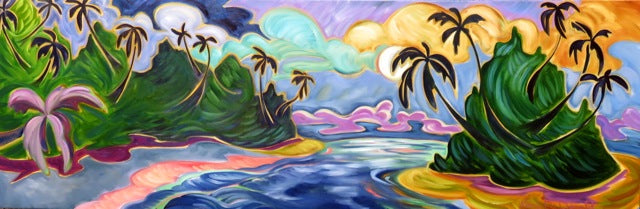 マウイ島のアーティスト、キム・マクドナルドは、この島の豊かな美しさに心を奪われています。彼女は何十年もの間、パドルボード、ダイビング、カイトサーフィンを楽しみ、ジャングルの小道を登ってマウイ島の息を呑むような滝へと旅してきました。キムはただ見たものを描くのではなく、自分が知っているものを描くことで、不思議な光と影、流れるような月、豊かな色彩と香り、そして波の豊かな音色を表現しています。