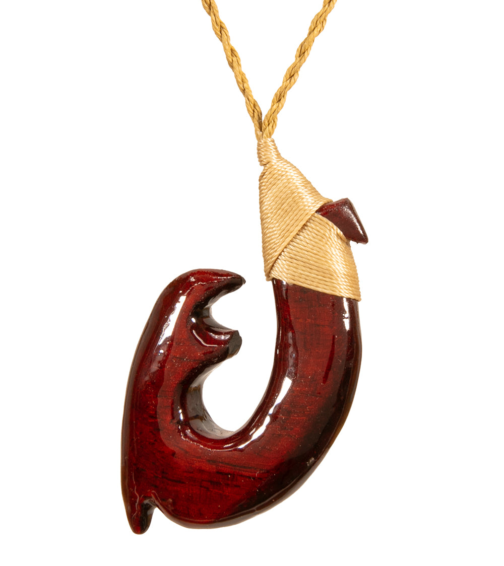 ハワイの職人デューイ・メデイロスは、カーリーコア、パドーク、パープルハートといったハワイ産の堅木を使い、美しいフィッシュフックペンダントを制作しています。