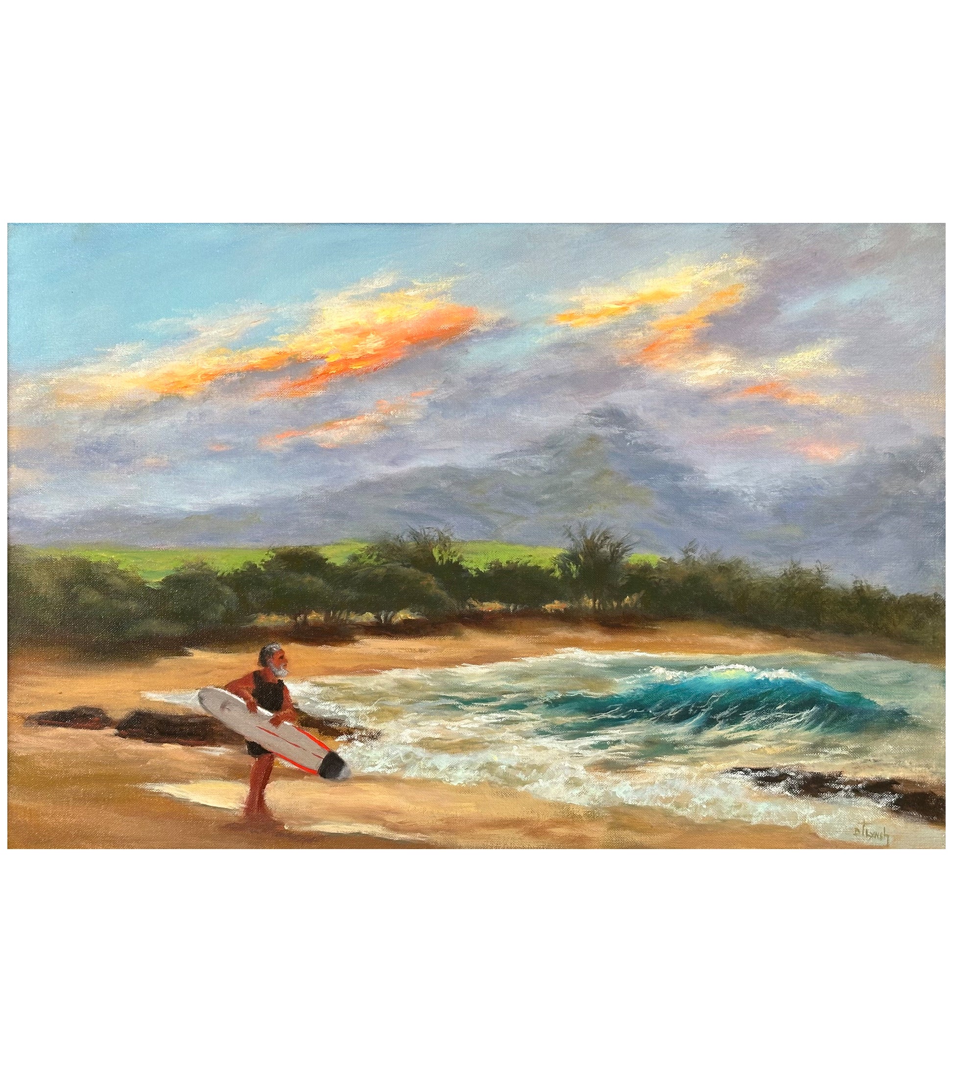 マウイ島出身のアーティスト、デブ・リンチは、絵画、サーフィン、サイクリングに情熱を注いでいます。その順番は、日によって必ずしも同じではありません。デブは伝統的な芸術の訓練を受けたアーティストで、マウイ島での生活を通して、美しさ、驚き、そして刺激を見出しています。彼女は、咲き誇る花々、穏やかな人々、雄大な空、そして轟く波といった静かなひとときからインスピレーションを得ています。