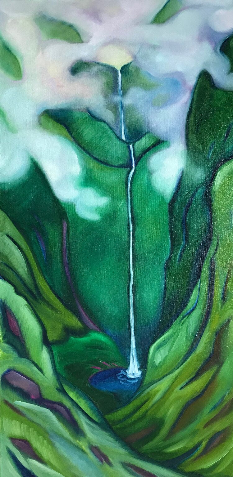 キム・マクドナルドは、マウイ島で食し、眠り、呼吸する日々を送っています。彼女は自身の経験を魔法のように芸術へと昇華させています。新作シリーズについて、キムはこう語っています。「1930年代にハワイを訪れたジョージア・オキーフが描いた風景画にインスピレーションを受け、ハワイの壮大な風景と滝を描きました。ハワイ諸島の隠れた名所を描いた新作シリーズを通して、オキーフのインスピレーションを感じていただければ幸いです。」
