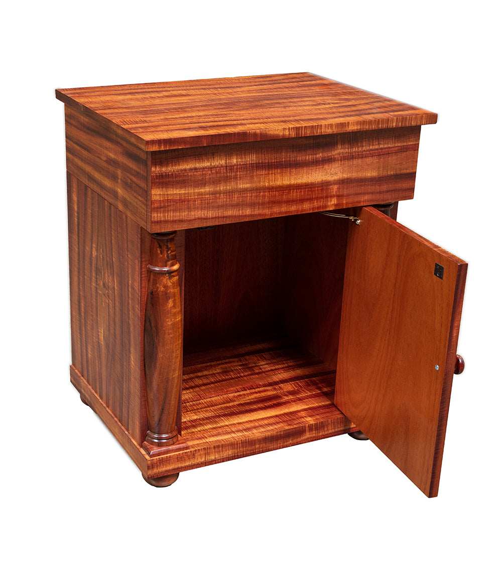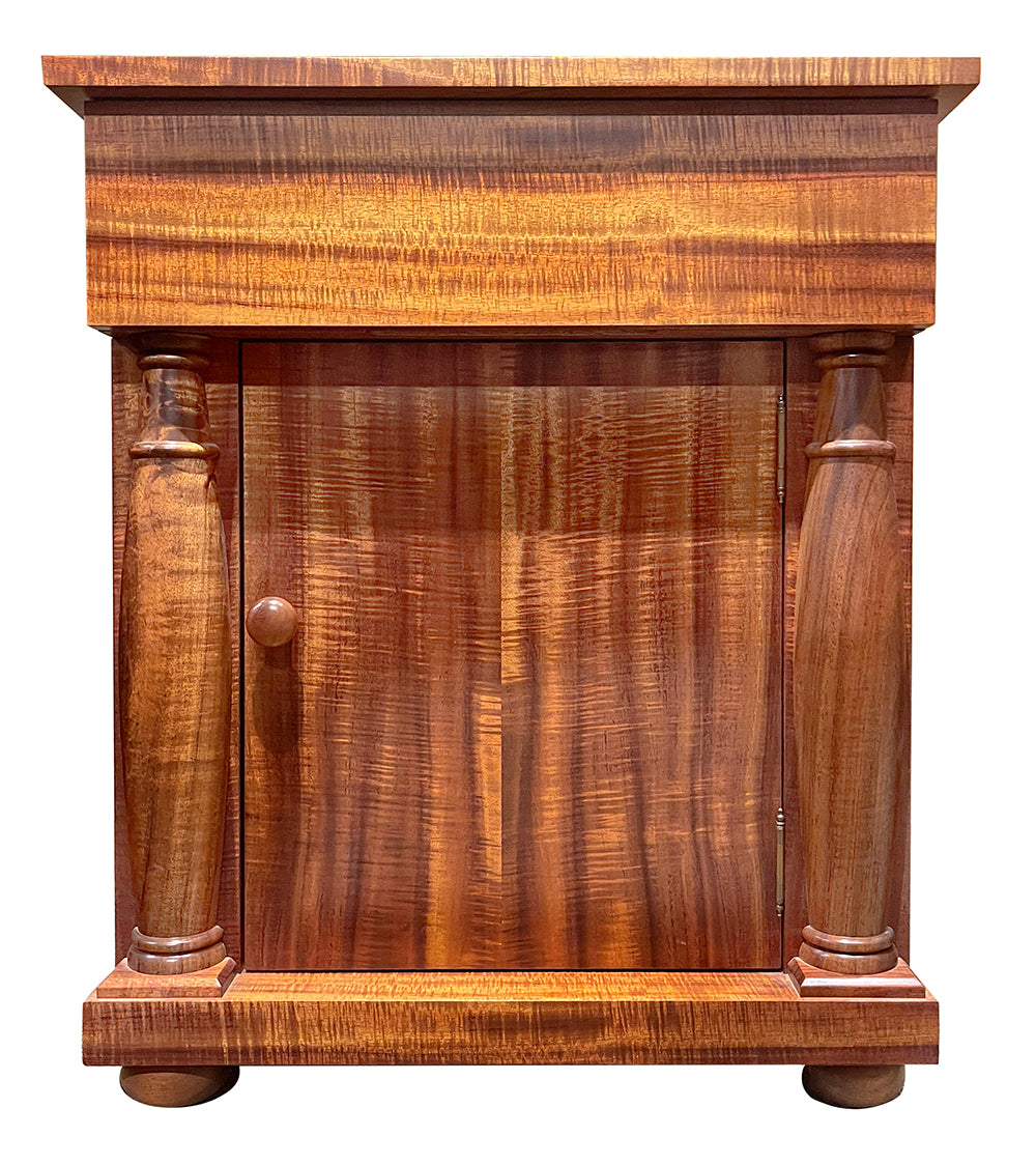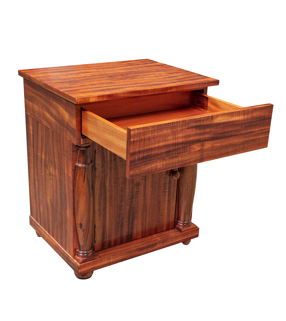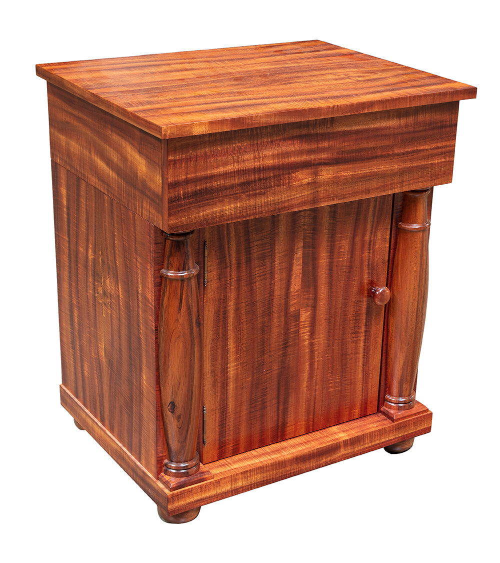 クイーン・エマ・ナイトスタンドは、マーティン&マッカーサー社の職人たちがエマ王妃に敬意を表してデザインした、贅沢な新ラインの一つです。エマ王妃は、ジョン・ヤング・オロハナ(カメハメハ大王の英国生まれの王室顧問兼随伴者)と、カメハメハ3世の姪であるカオアナエハ王女の孫娘でした。このラインには、精巧な新作クイーン・エマ・ベッドも含まれています。このデザインラインは、ハワイ島産のコア材の豊かな曲線と自然な色合いのコントラストを際立たせています。ホノルルにある当社の家具工房で製作されるこのラインは、最高級の優雅な暮らしを体現するものです。