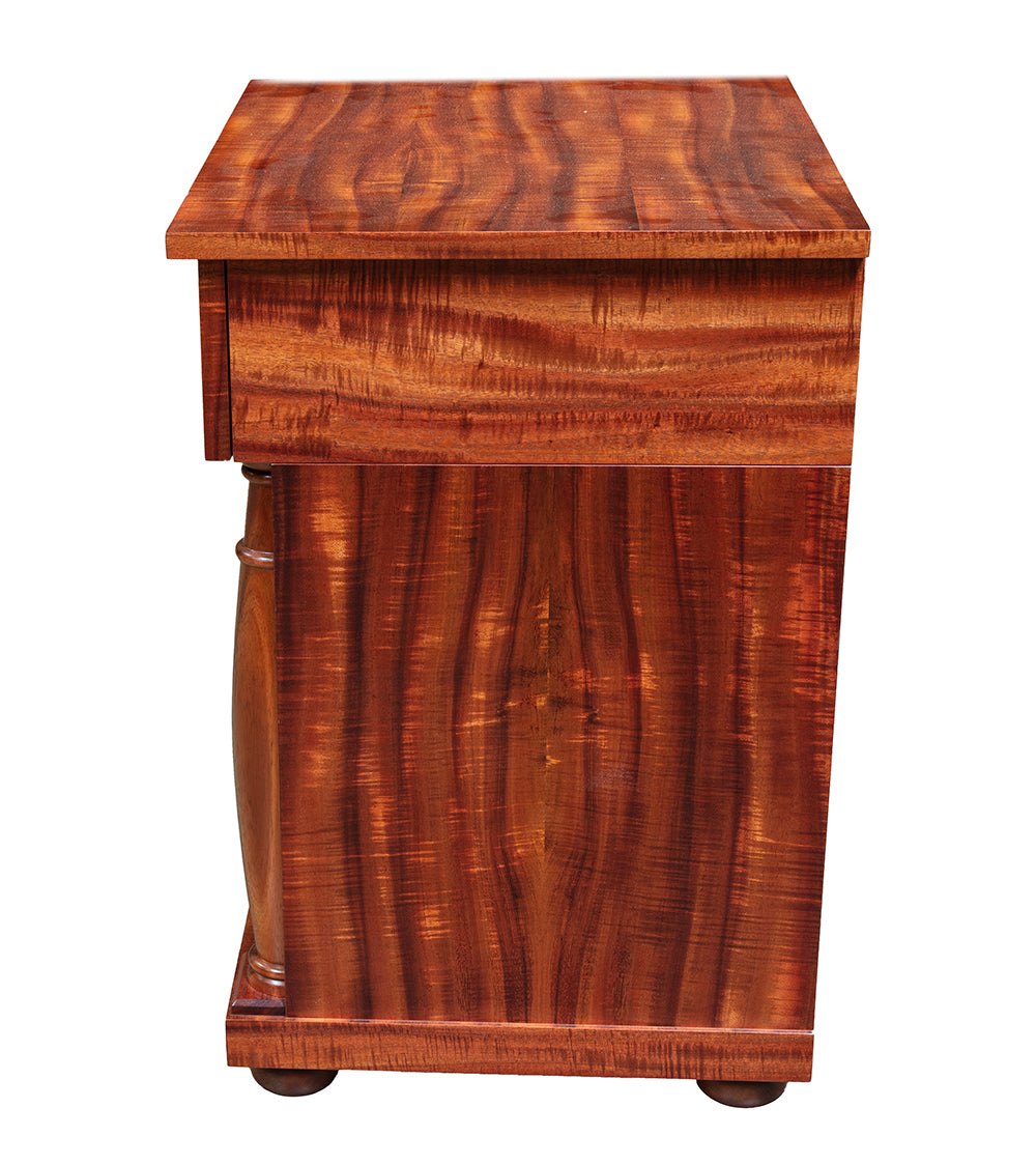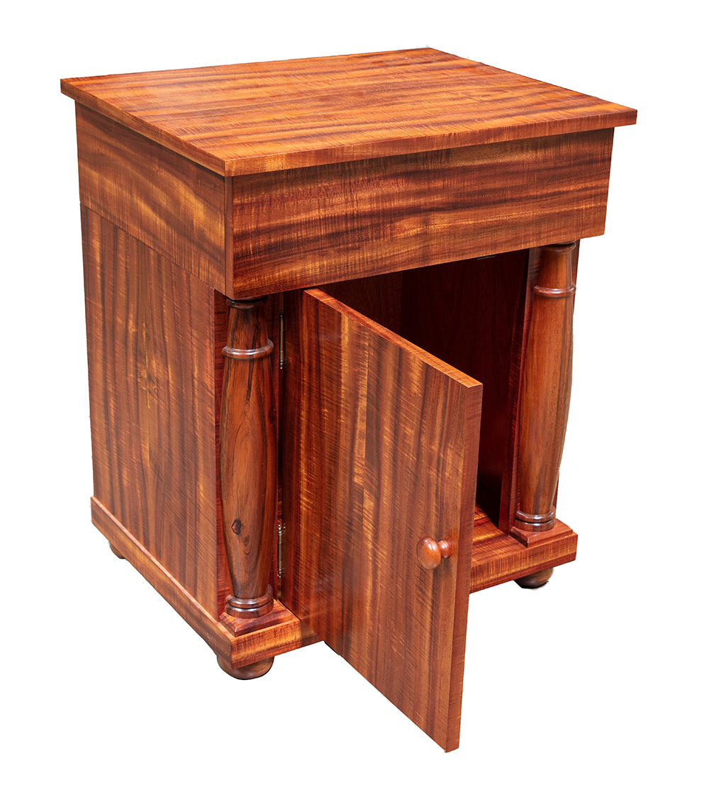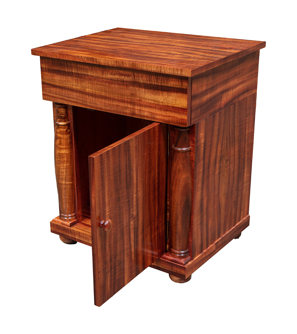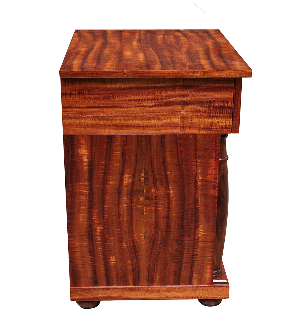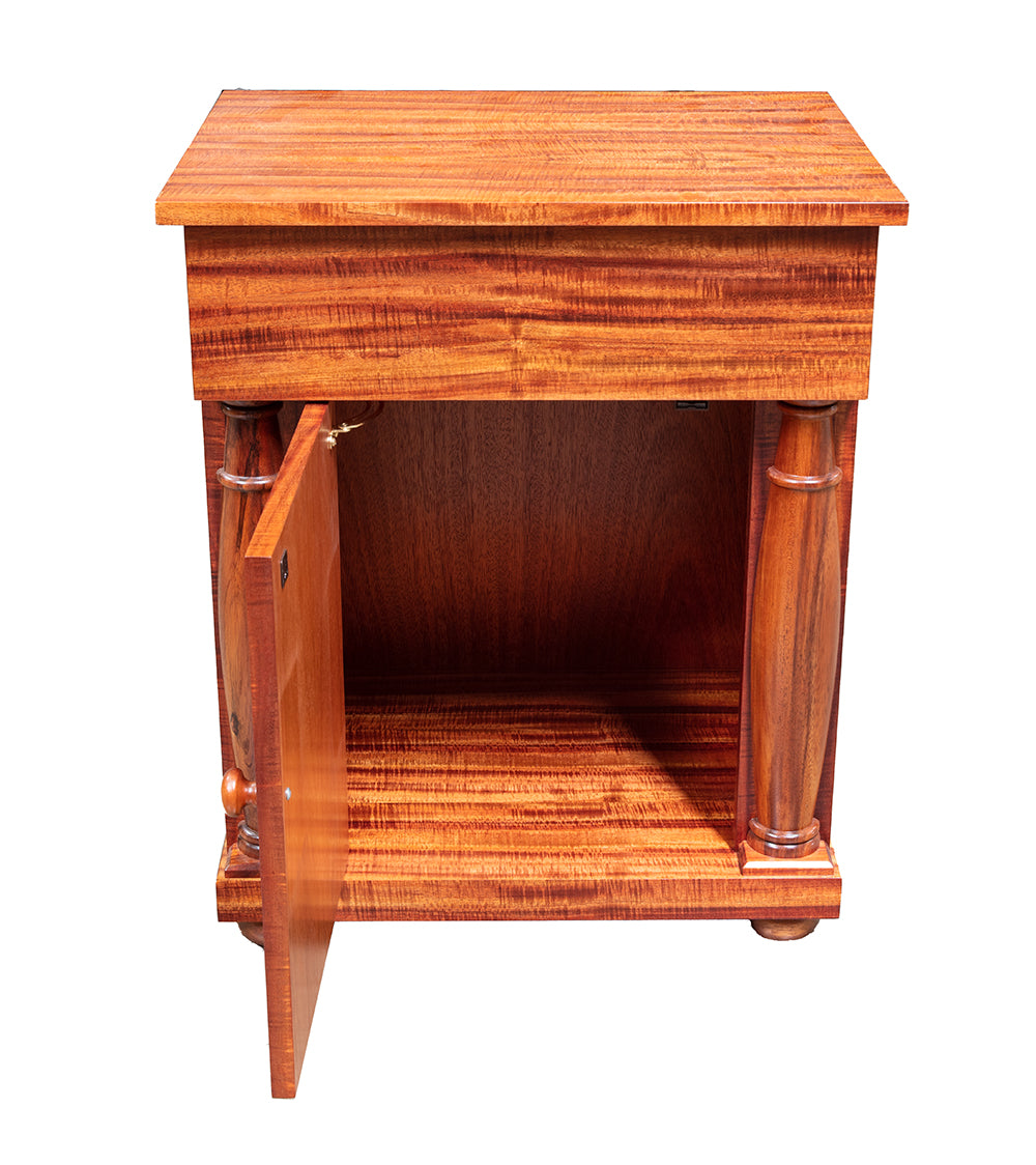 クイーン・エマ・ナイトスタンドは、マーティン&マッカーサー社の職人たちがエマ王妃に敬意を表してデザインした、贅沢な新ラインの一つです。エマ王妃は、ジョン・ヤング・オロハナ(カメハメハ大王の英国生まれの王室顧問兼随伴者)と、カメハメハ3世の姪であるカオアナエハ王女の孫娘でした。このラインには、精巧な新作クイーン・エマ・ベッドも含まれています。このデザインラインは、ハワイ島産のコア材の豊かな曲線と自然な色合いのコントラストを際立たせています。ホノルルにある当社の家具工房で製作されるこのラインは、最高級の優雅な暮らしを体現するものです。