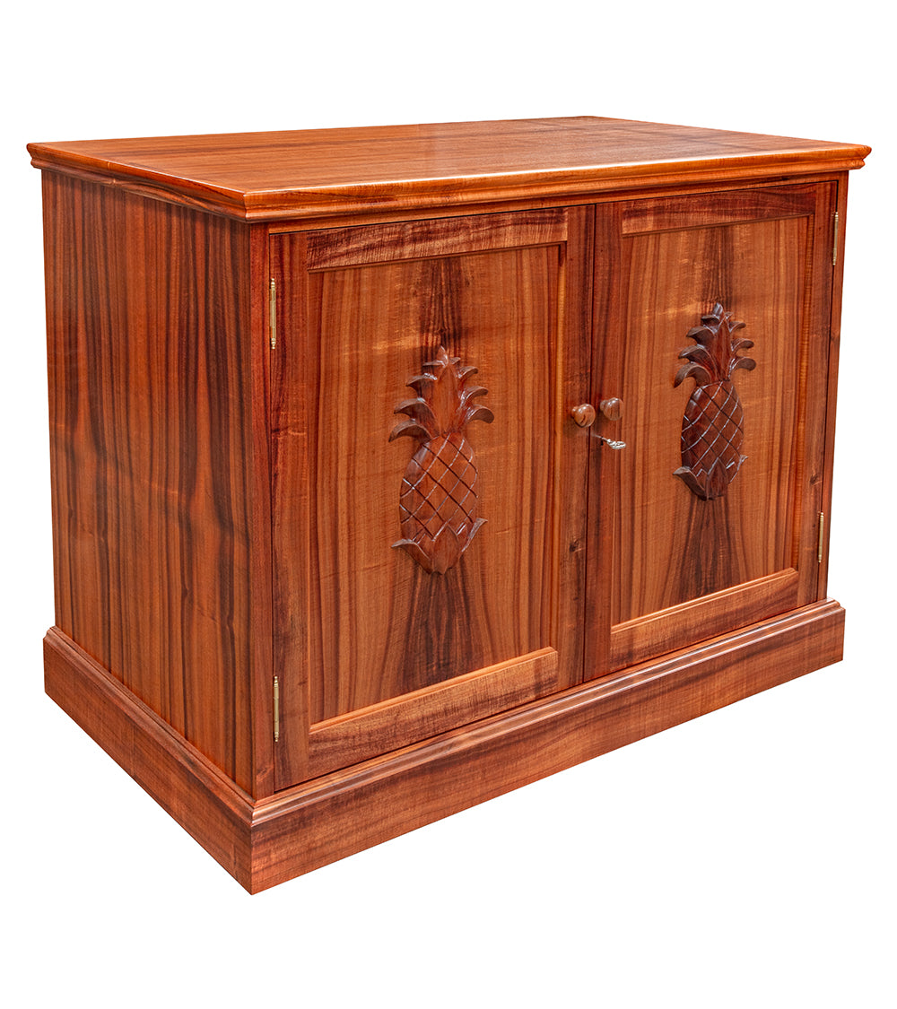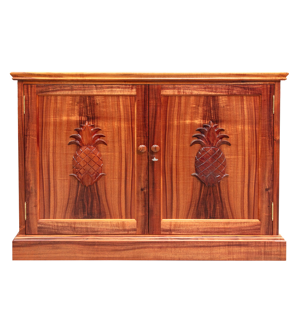 マーティン&マッカーサー社の職人たちは、古き良きハワイの伝統的なプランテーション・エステートにインスピレーションを得て、リッチモンド・ビュッフェ・キャビネットをデザインしました。キャビネットの各扉にあしらわれた手彫りのパイナップルは、ハワイの歴史におけるこのジューシーな果物の重要性を反映しています。パイナップルは、多くの大陸や文化において、歓迎と優雅なおもてなしの象徴です。まさに「優雅なハワイの暮らし」の普遍的なシンボルと言えるでしょう。
