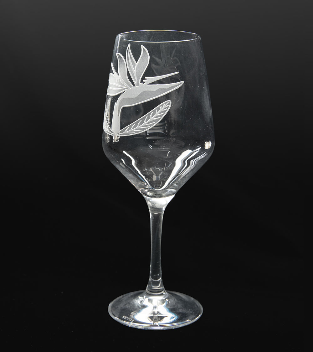 砂でエッチングされた極楽鳥の赤ワイングラス