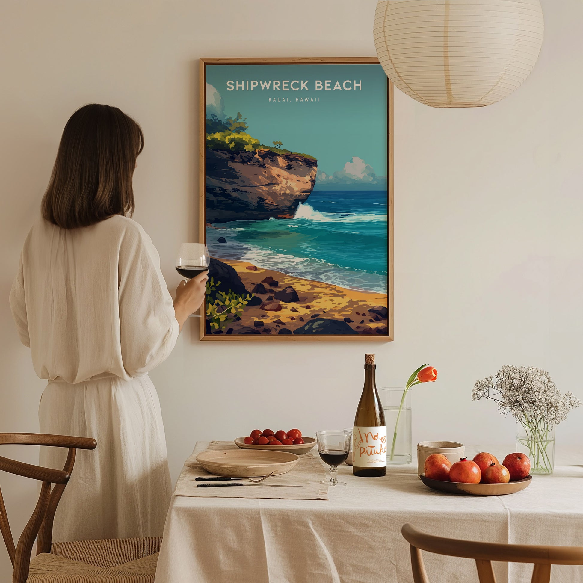 カウアイ島の太陽が降り注ぐサウスショアの人気スポット、シップレックビーチの荒々しい美しさを、鮮やかでシネマティックなアートプリントでご自宅にお届けします。ドラマチックな断崖と黄金色の砂浜に囲まれたこの作品は、勇敢な地元の人々がターコイズブルーの海に飛び込む象徴的な断崖を捉えています。打ち寄せる波と豊かな植生は、ハワイの冒険、海辺の静寂、そして島のロマンスを視覚的に表現した完璧な作品となっています。