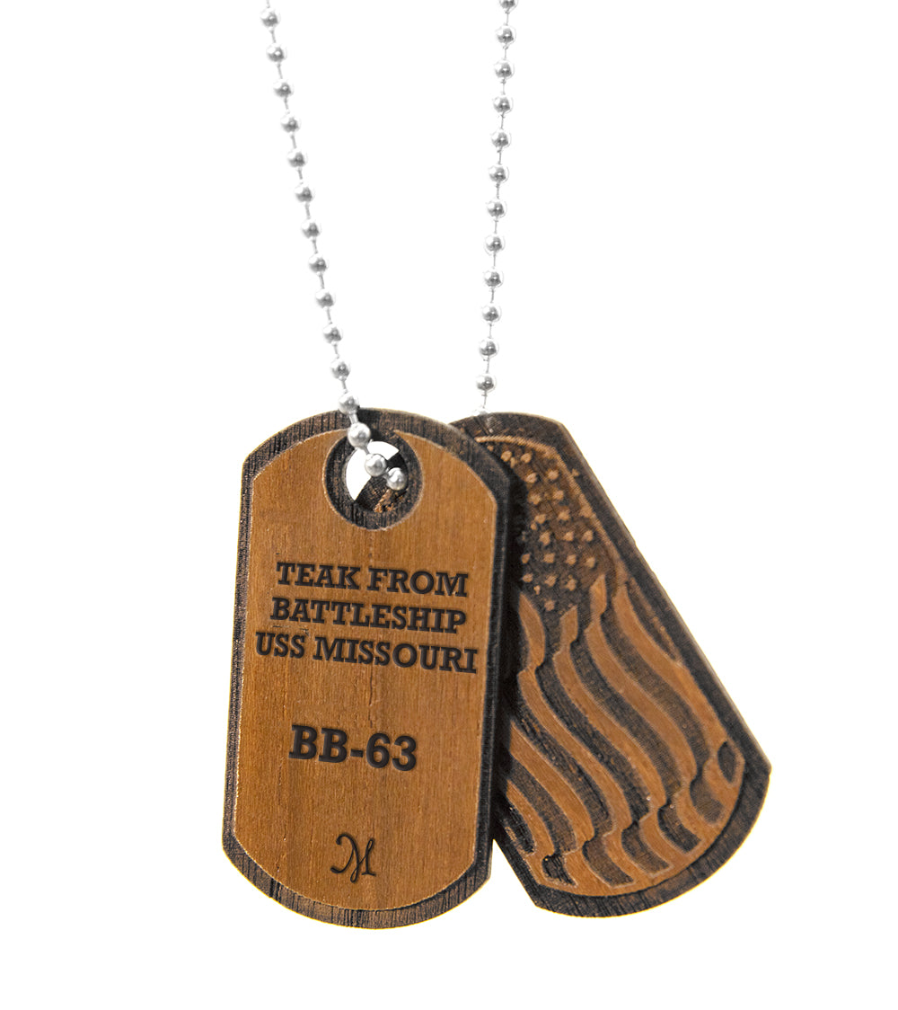 マーティン&マッカーサー社の職人たちは、戦艦ミズーリのオリジナルデッキから採取されたチーク材を使用し、チーク材ドッグタグペンダントを製作しています。それぞれのチーク材ペンダントは、第二次世界大戦で従軍し、世界平和のために戦った軍の英雄たちへの敬意と敬意を込めて作られています。このオリジナルのチーク材は、戦艦ミズーリの修復とオリジナルデッキの交換の際に回収されたものです。チーク材ペンダントの収益の一部は、戦艦ミズーリの保存と、その歴史における役割を伝えるという、戦艦ミズーリ記念協会の使命に役立てられています。