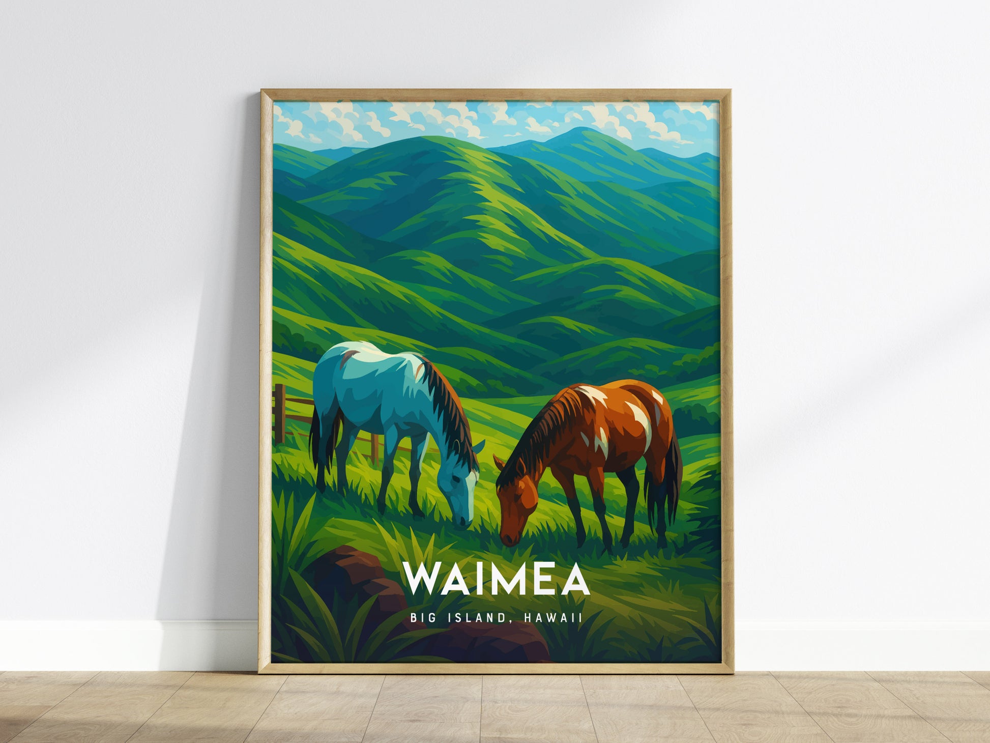 ワイメアを描いたこの鮮やかなイラストで、ハワイの緑豊かで牧歌的な美しさを称えましょう。ビッグアイランドの北斜面に位置するワイメアは、涼しい気候、緑豊かな丘陵地帯、そしてパニオロ(ハワイのカウボーイ)文化で知られています。この作品は、柔らかな雲と青い空の下、エメラルドグリーンの山々に囲まれた2頭の馬が草を食む、田園地帯の静かなひとときを捉えています。
