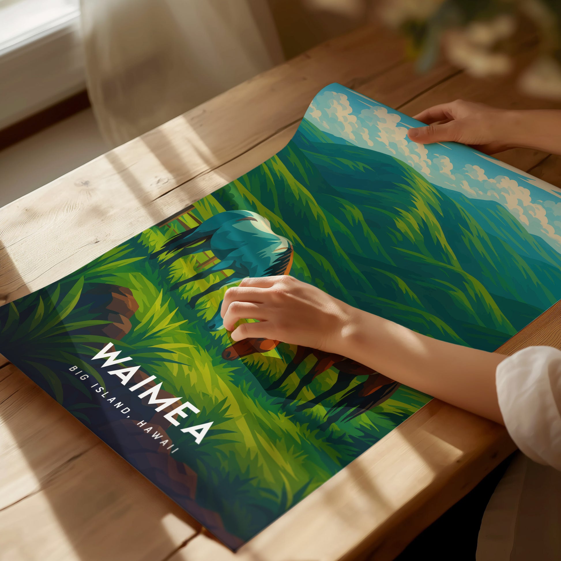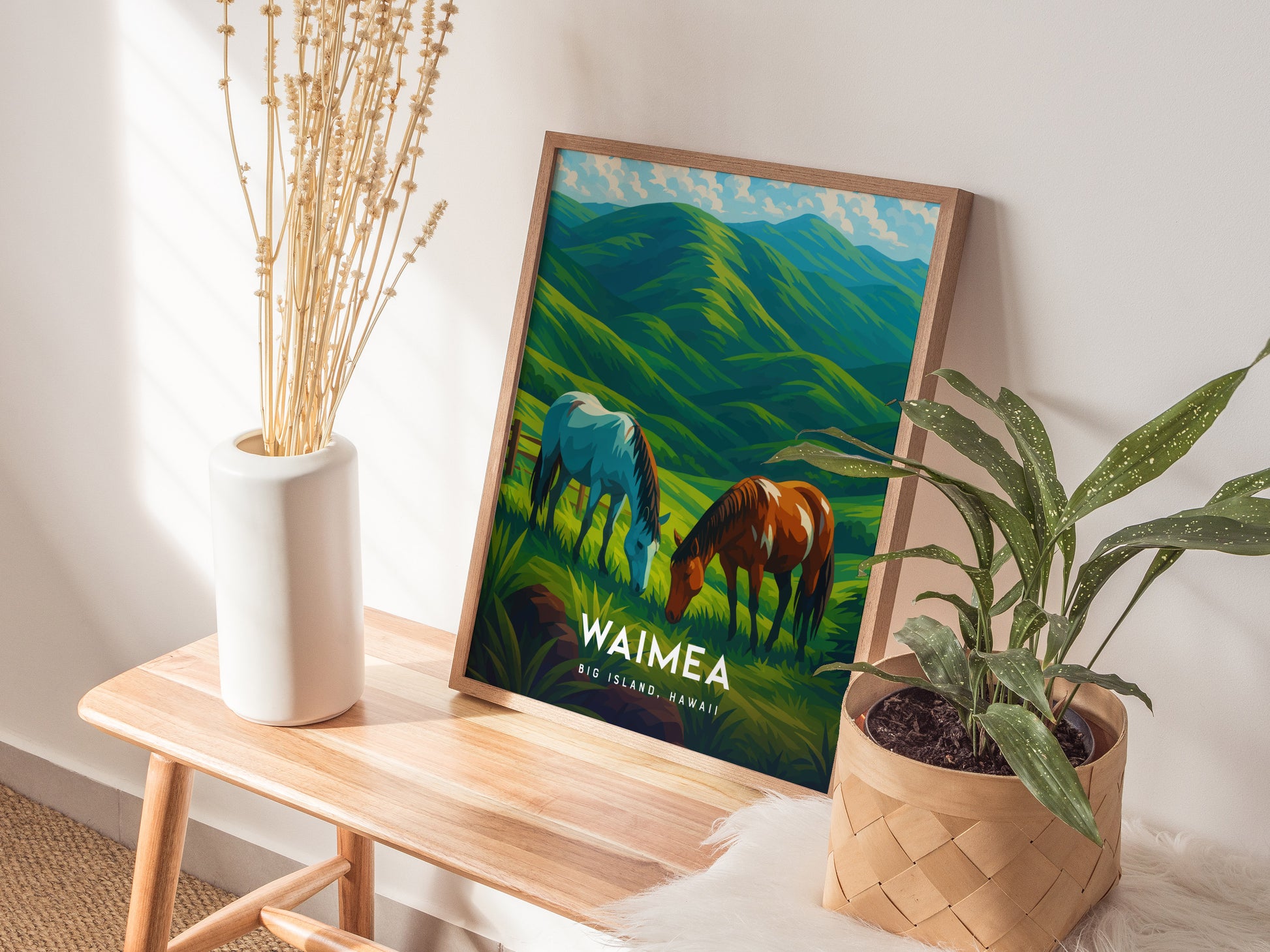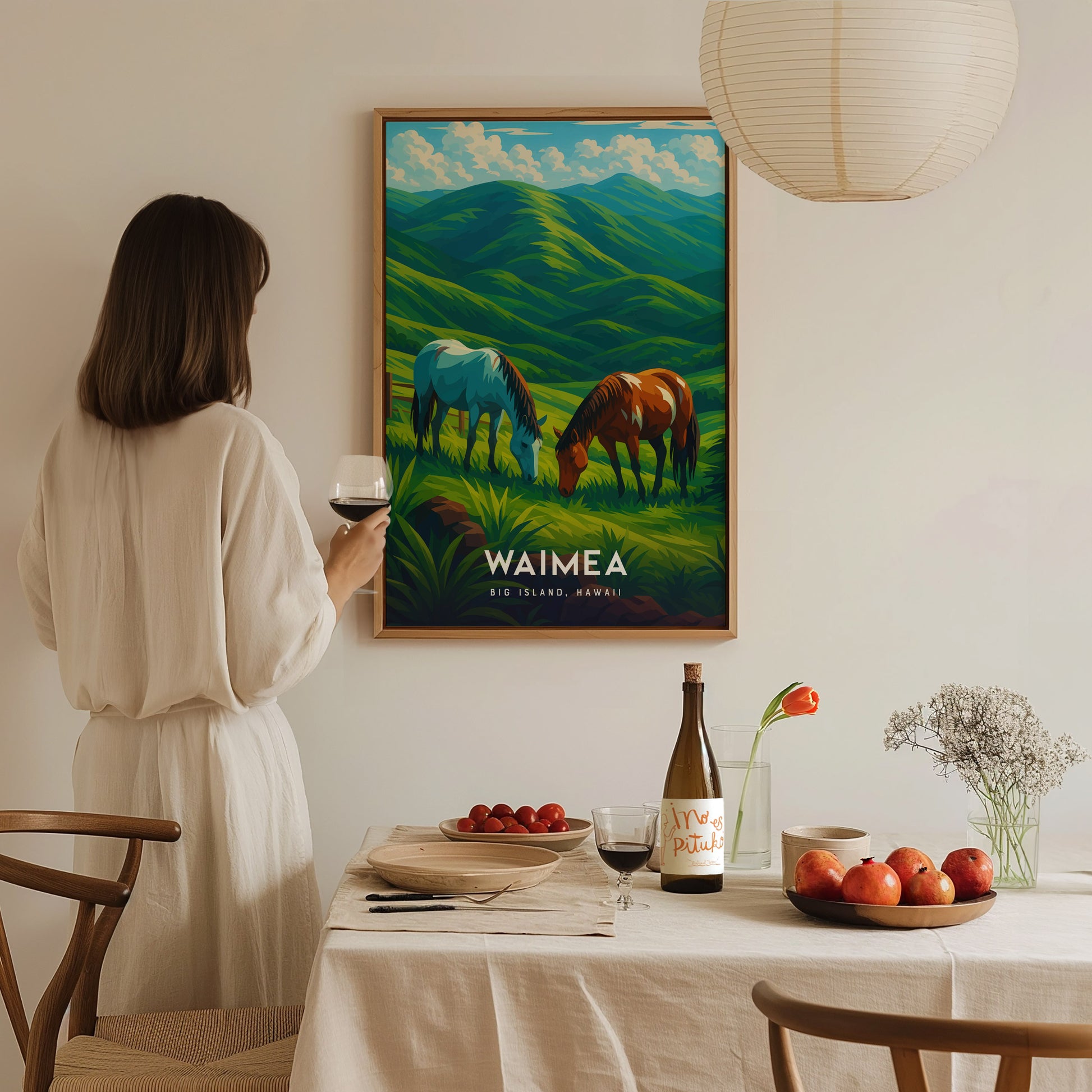 ワイメアの曲がりくねった道を散策したり、山々を背景に草を食む馬を見かけたり、あるいはのんびりとした田舎暮らしを愛するなら、この作品はそんな気持ちを心に刻んでくれるでしょう。ハワイ、乗馬、あるいは静かな田園風景を愛する人への、心に響く贈り物となるでしょう。