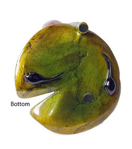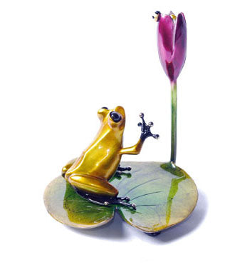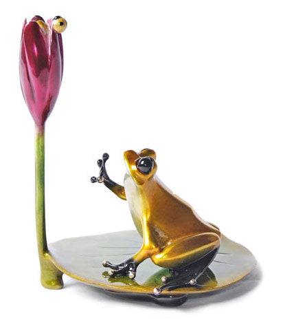 フラワーシリーズの第8作目、「睡蓮」。鮮やかな睡蓮の葉の上で辛抱強く待ち続けるカエルは、光り輝くカエルが黄金のチャンスを掴みます。隠れたオタマジャクシと定番の黄色いテントウムシが、この彫刻を魅力的な情景へと演出します。