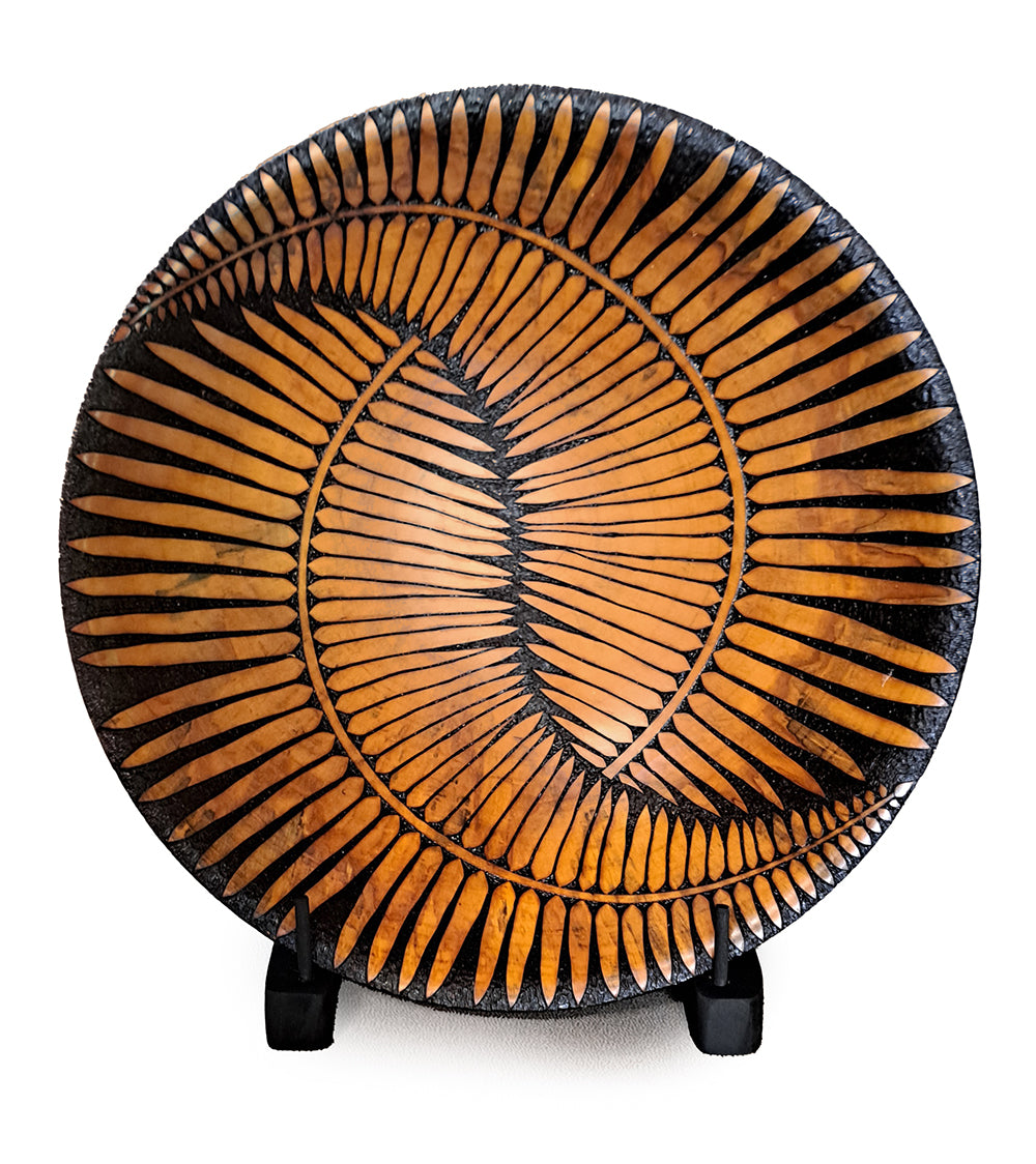 ハワイ島の職人マイケル・パトリック・スミス氏は、「パイログラフィー」と呼ばれる緻密な木材焼成技法を用いて、この見事な花瓶を制作しました。最初に旋盤で挽いた松材の器の裏面を焼き尽くし、残った絵柄だけがそこにあります。マイケル氏によると、パイログラフィー技法に作業時間の80%、ボウルの旋盤加工には20%しかかからないそうです。