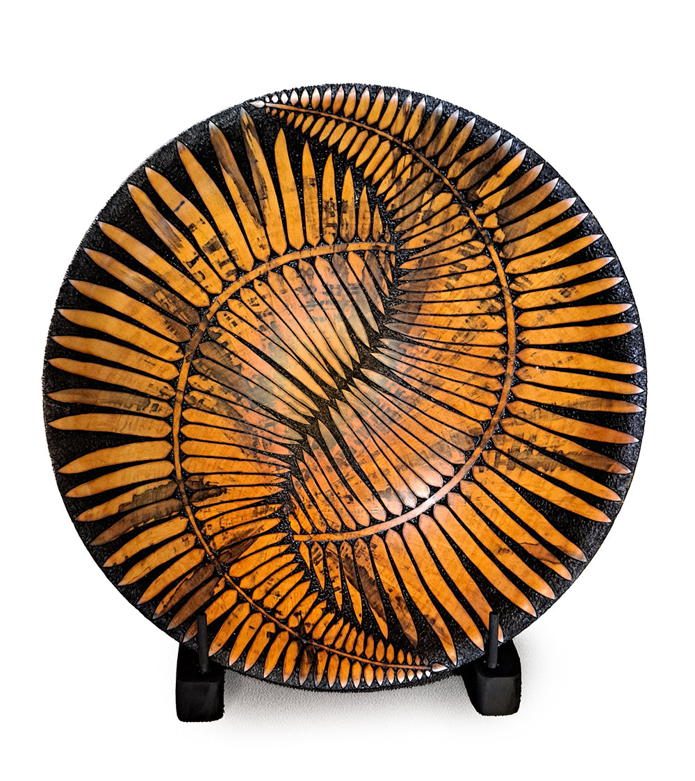 ハワイ島の職人マイケル・パトリック・スミス氏は、「パイログラフィー」と呼ばれる緻密な木材焼成技法を用いて、この見事な花瓶を制作しました。最初に旋盤で挽いた松材の器の裏面を焼き尽くし、残った絵柄だけがそこにあります。マイケル氏によると、パイログラフィー技法に作業時間の80%、ボウルの旋盤加工には20%しかかからないそうです。