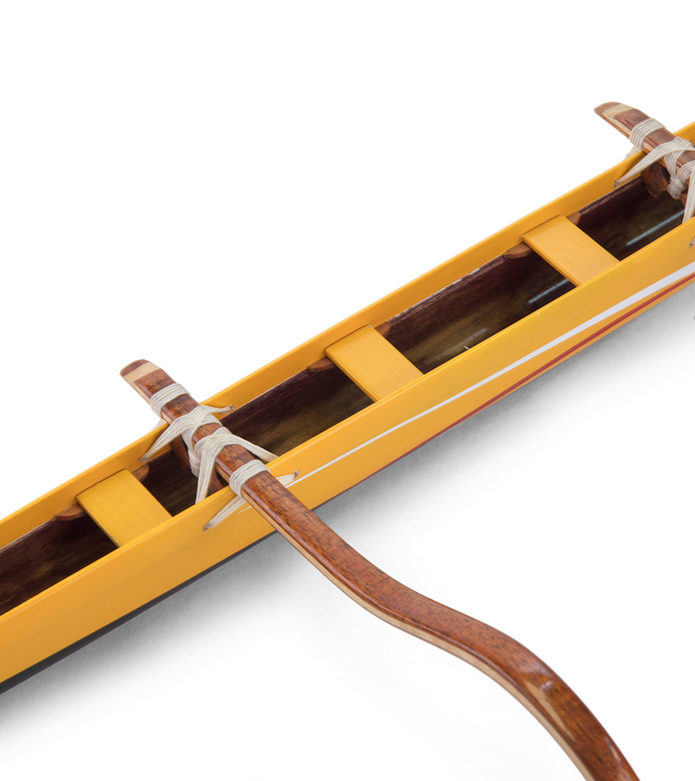 Hawaii craftsman Greg Scott creates beautifully detailed scale model Hawaiian outrigger canoes. Each canoe is hand-carved from curly Koa wood harvested from dead trees in the Big Island. Greg uses other exotic hardwoods as accents for his canoes.