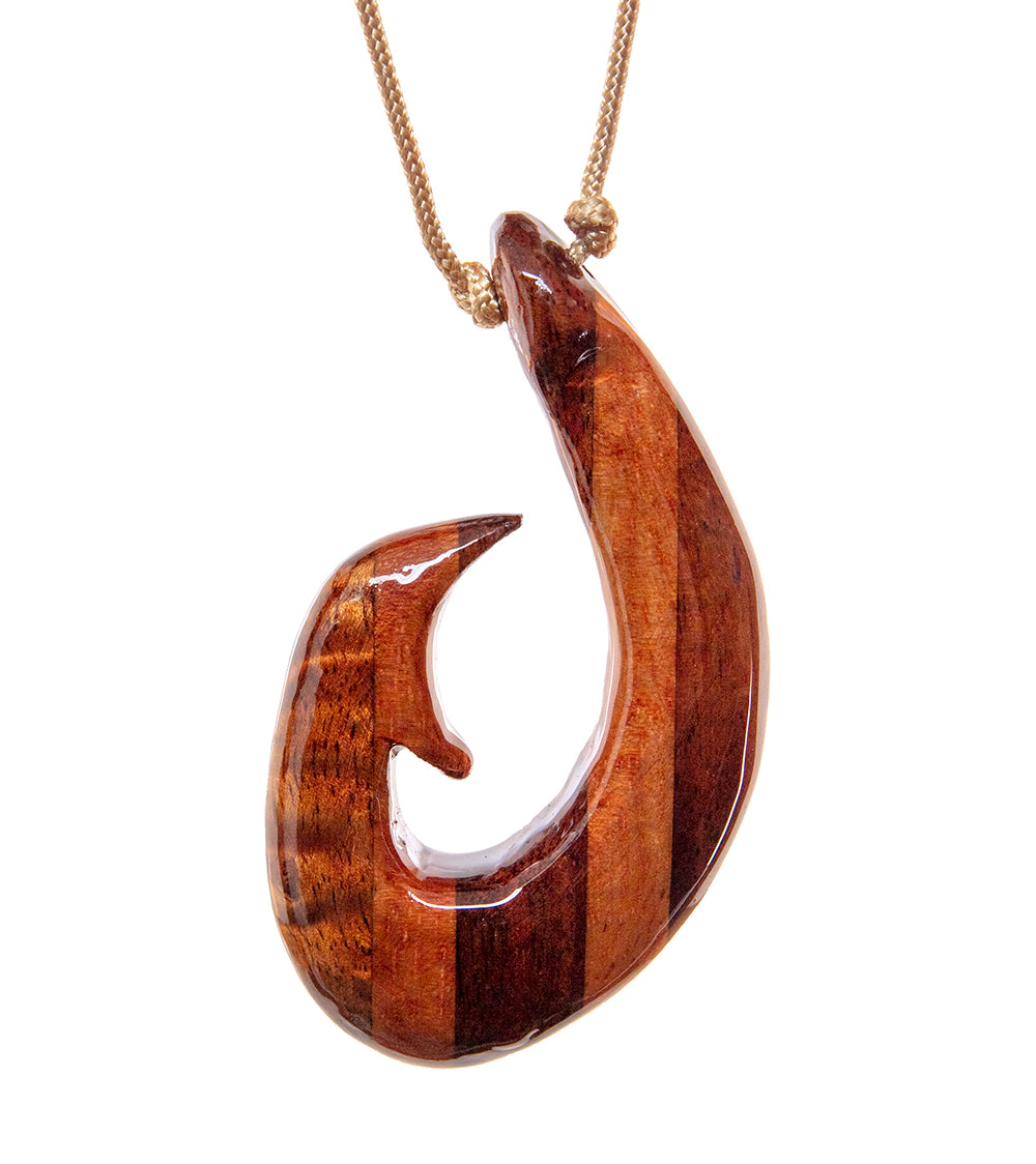 Hawaiian craftsman Dewey Medeiros creates stunning fish hook pendants with Hawaiian hard woods such as curly Koa, padauk and purple heart.