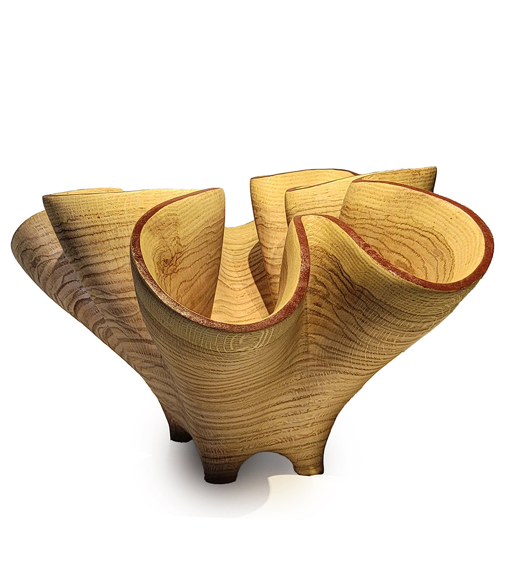 This beautiful form was sculpted from a figure piece of Pin Oak. The form was inspired by studying folded glass shapes. Sanded then sandblasted to accent the medullary rays and grain lines. Satin finish.