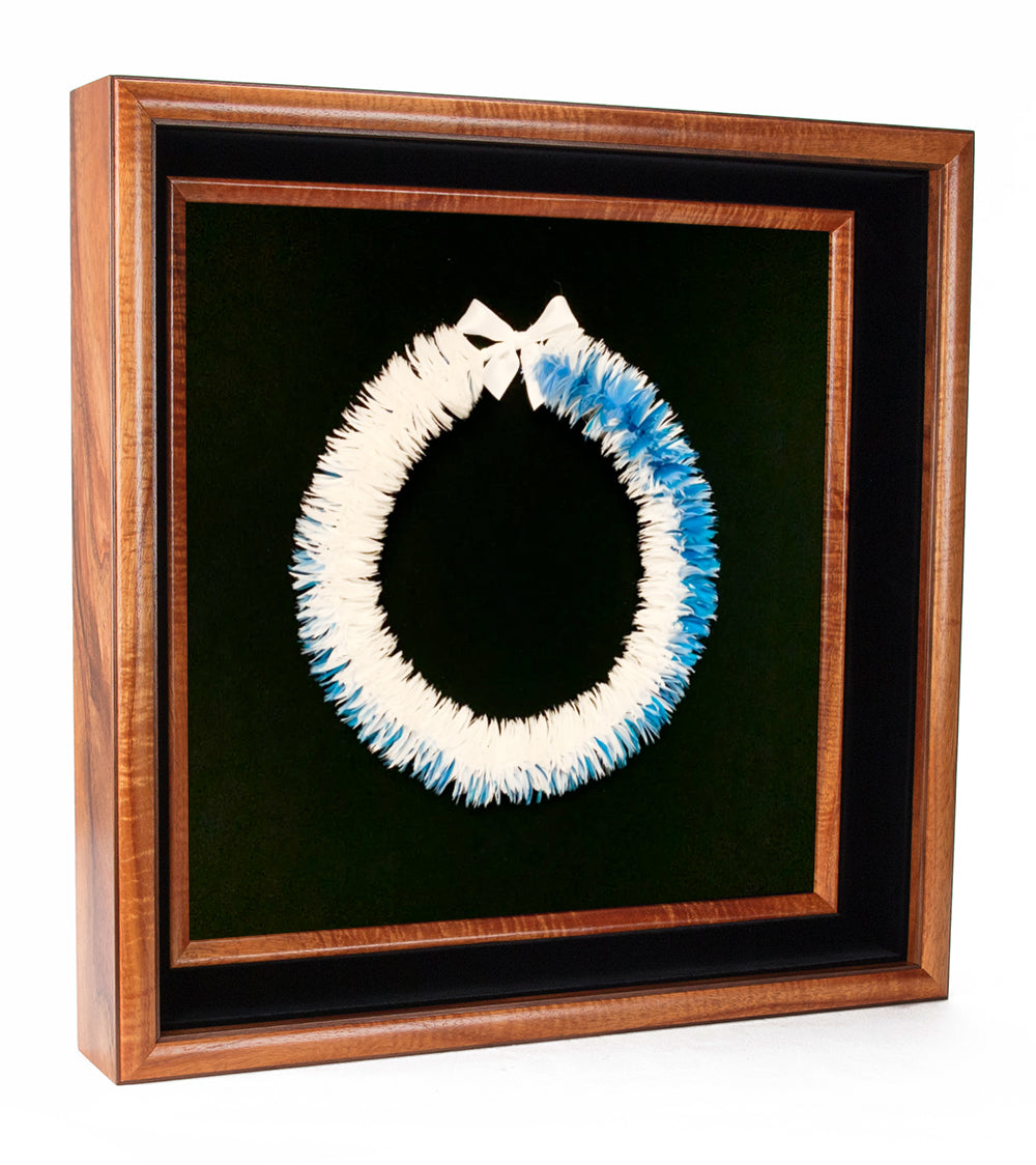Framed in Koa shadow boxes by Martin & MacArthur. These feather lei are perfect for a home or office setting. Allow 6-8 weeks for production if not in stock.