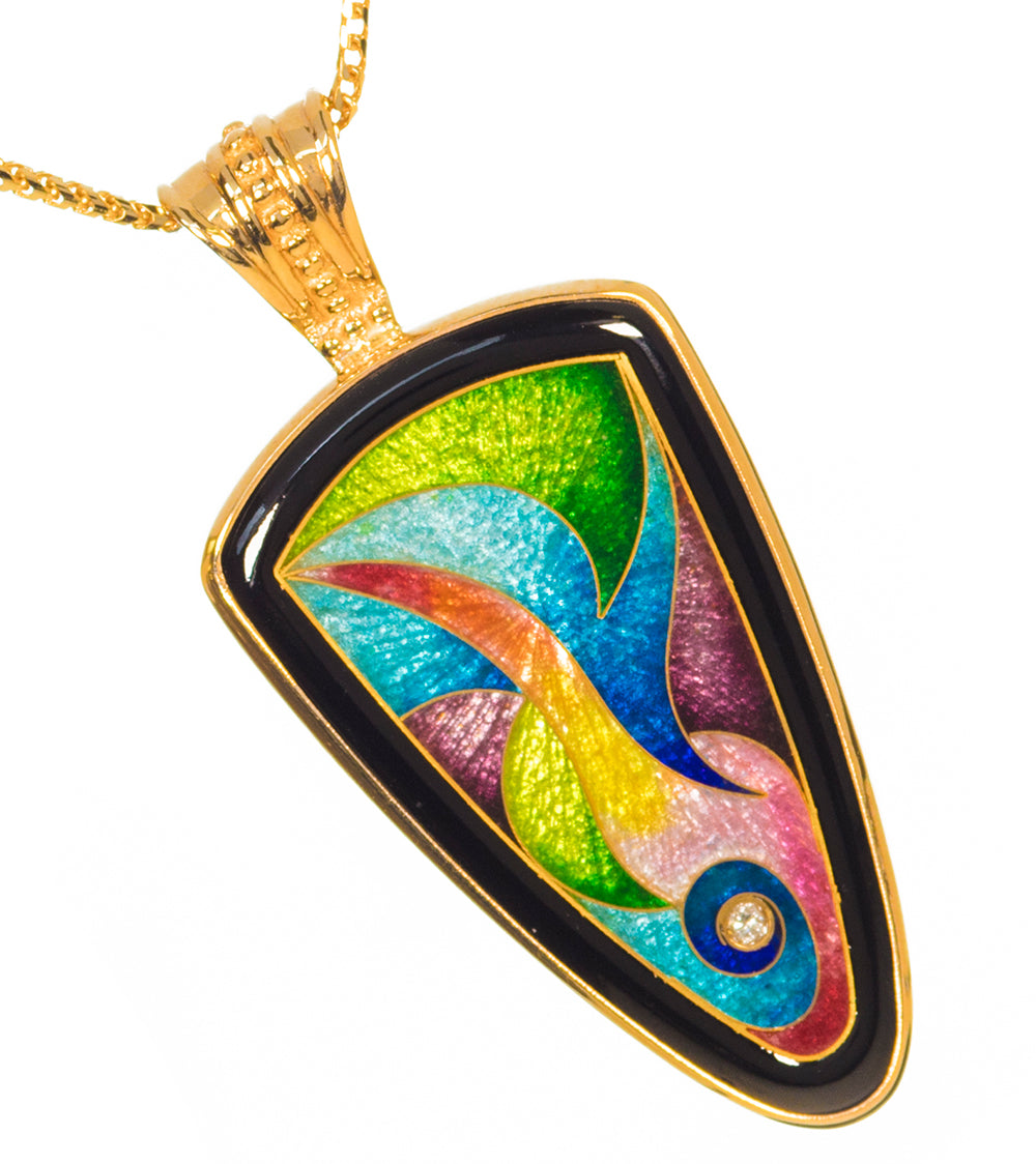 Thin 24K gold wires are hand-cut and bent to form intricate designs. Up to 10 layers of enamel are fired at least 12 times at 1450-degrees to create the iridescent depth and nuances of color in each piece.