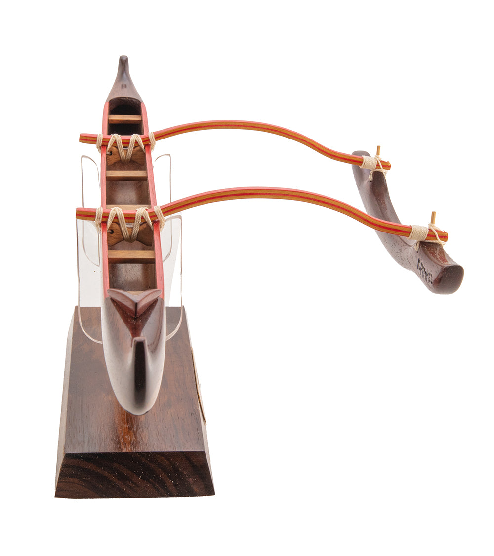 Through dedicated research Francis has become a legitimate expert on the making of ancient Hawaiian craft, especially some of the more colorful canoes of the early twentieth century. Francis has chosen to use no paints in his fine wooden models but rather to inlay beautiful naturally colored woods at painstaking effort in their stead using Koa, Milo, Ulu (Breadfruit), Lemonwood, and Primavera, as well as Ebony, Cocobolo, and exotic Tamarind wood.