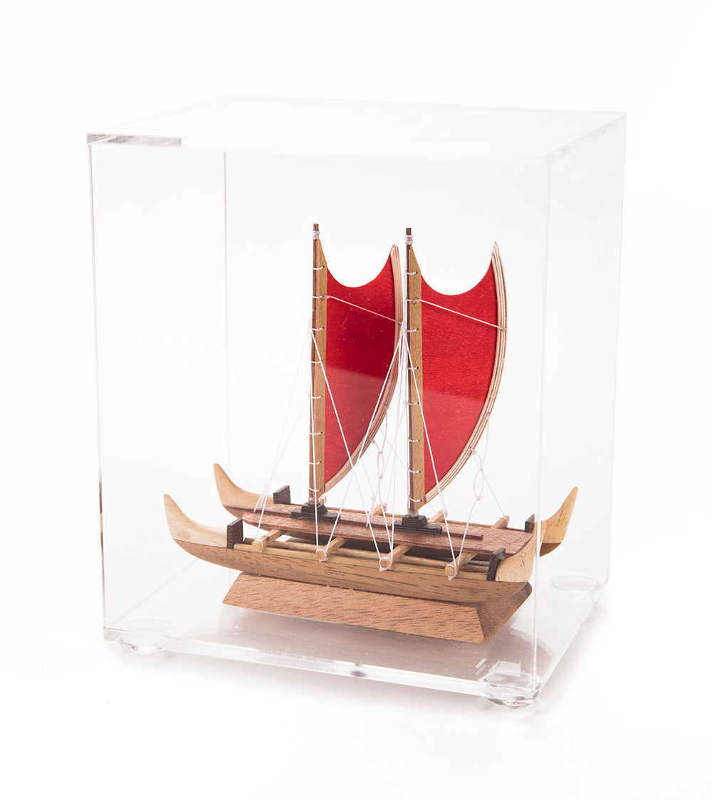 Through dedicated research Francis has become a legitimate expert on the making of ancient Hawaiian craft, especially some of the more colorful canoes of the early twentieth century. Francis has chosen to use no paints in his fine wooden models but rather to inlay beautiful naturally colored woods at painstaking effort in their stead using Koa, Milo, Ulu (Breadfruit), Lemonwood, and Primavera, as well as Ebony, Cocobolo, and exotic Tamarind wood.