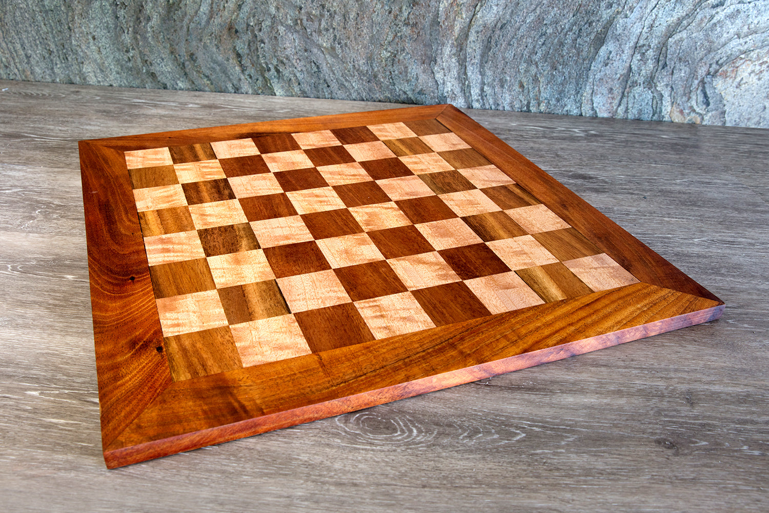 Retired U.S. Navy veteran Dale Dennison created Koa chess boards using dark, highly-figured Koa from the Big Island of Hawaii. The lighter accent wood is made with Hawaiian Mango. Available in two sizes. Production time is 2-4 weeks until delivery.