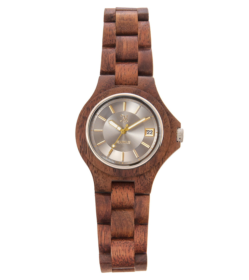 Our Koa Wood Watches are made with solid Koa from our own private stock harvested on the Big Island. We hand-selected the Koa for its beautiful color and grain patterns. No veneers. Solid Koa.