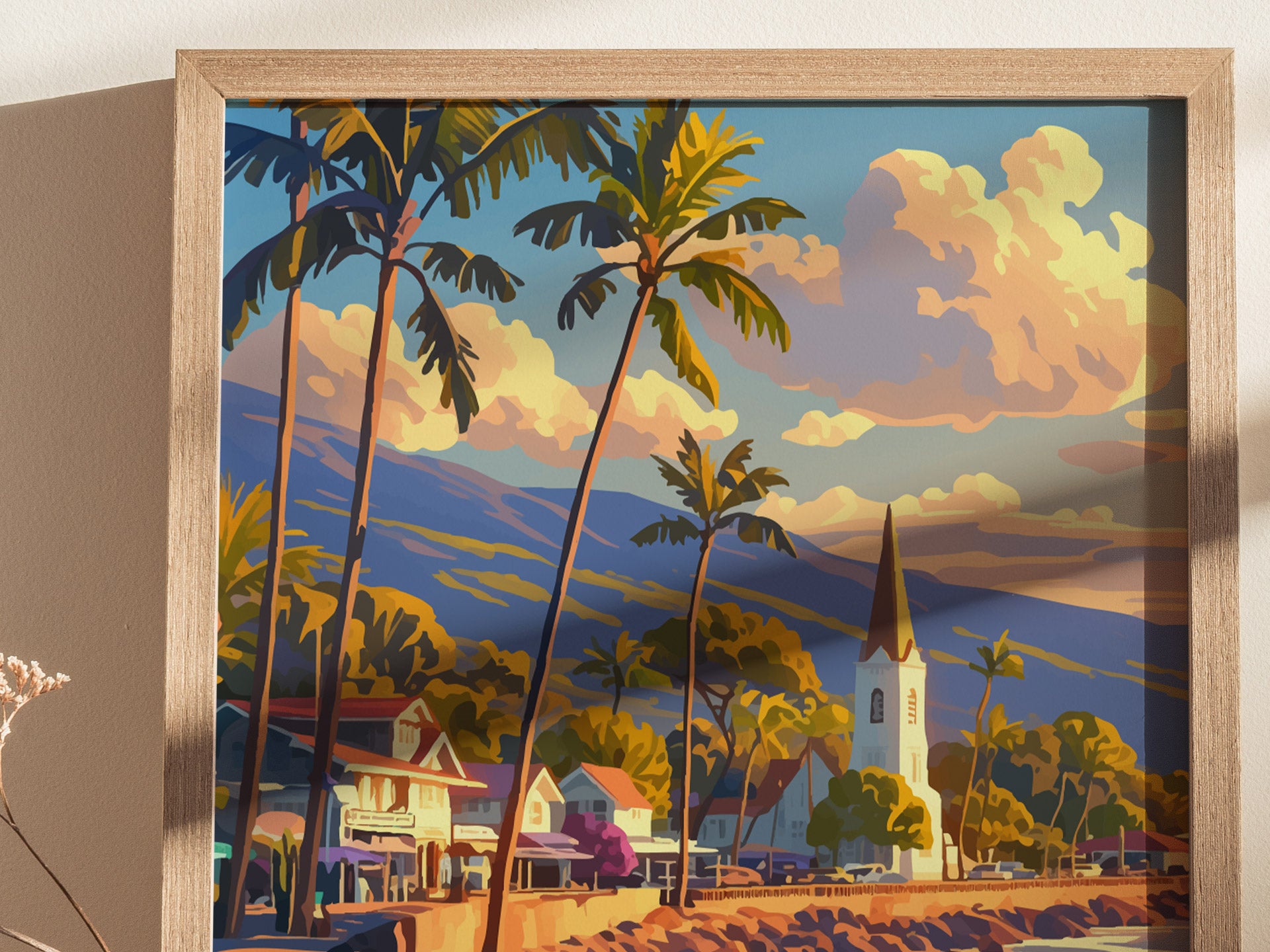 Printed on museum-quality matte paper, this piece is available in framed and unframed formats. Whether hung in a beach house, living room, or creative workspace, it radiates warmth and the laid-back energy of island life. A perfect visual escape for those who dream of gentle surf, palm-lined streets, and sunsets over the Pacific.