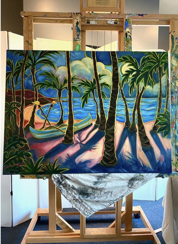 Maui artist Kim McDonald delights in the lush beauty of the island. She has spent decades paddle boarding, diving, kite-surfing, or journeying up jungle trails to Maui's breathtaking waterfalls. Kim doesn't just paint what she sees, she paints what she knows, revealing uncanny light and shadows, a liquid moon, lush colors and fragrances, or the rich music of the surf.