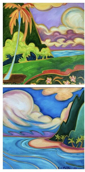 Maui artist Kim McDonald delights in the lush beauty of the island. She has spent decades paddle boarding, diving, kite-surfing, or journeying up jungle trails to Maui's breathtaking waterfalls. Kim doesn't just paint what she sees, she paints what she knows, revealing uncanny light and shadows, a liquid moon, lush colors and fragrances, or the rich music of the surf.