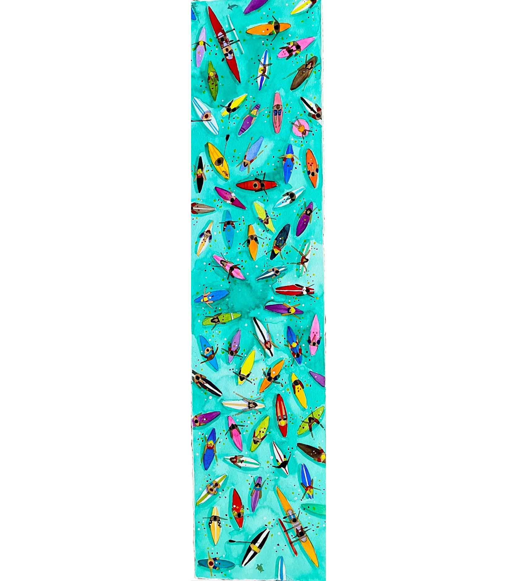 Sarah’s delightful “Paddle Out” watercolor paintings are inspired by the iconic pictures of surfers paying homage to Lahaina days after the devastating fire. Sarah wanted to feature those in the broader Maui community who were all affected by the fire. She lovingly paints each surfer and can speak about each one as if they are family. No two surfers are alike. But, the deep respect and love they share for Lahaina unites them all as one ohana.