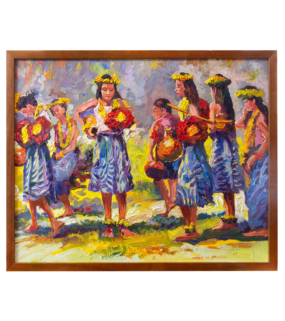 He enjoys capturing on canvas the magic of everyday moments of life in Hawaii. While Hawaii’s beaches and mountains are always favorite subjects, Mark has a passion of painting life well lived, including delightful glimpses into Honolulu’s Chinatown, the vibrant Kaka’aoko waterfront, and local hang-outs in Haleiwa. In a recent collection, Mark highlights the serenity of Hula shared by young and old alike.