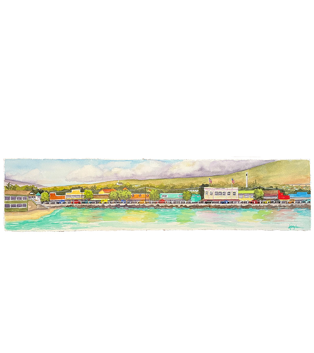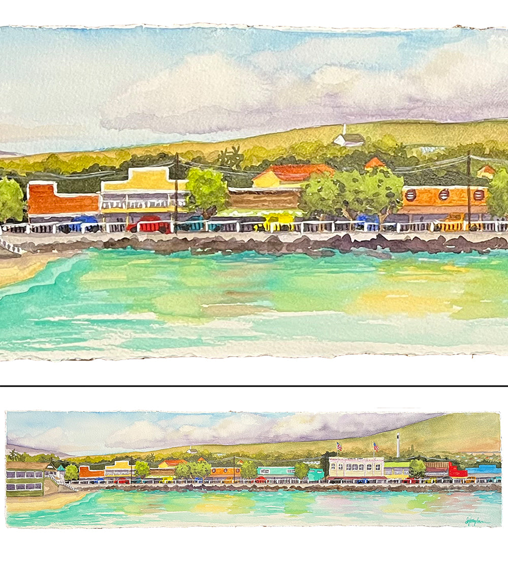 Sarah’s delightful “Paddle Out” watercolor paintings are inspired by the iconic pictures of surfers paying homage to Lahaina days after the devastating fire. Sarah wanted to feature those in the broader Maui community who were all affected by the fire. She lovingly paints each surfer and can speak about each one as if they are family. No two surfers are alike. But, the deep respect and love they share for Lahaina unites them all as one ohana.