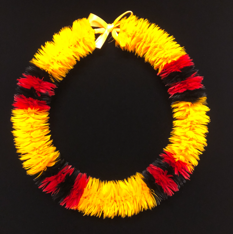 Expert Hawaiian feather lei artist Boris Kekaiuluikahikina Huang creates these stunning Hawaiian feather lei. He hand ties each feather individually using the ancient techniques of old Hawaii passed on to him by the late renowned feather lei practitioner Aunty Mary Lou Kekuewa.