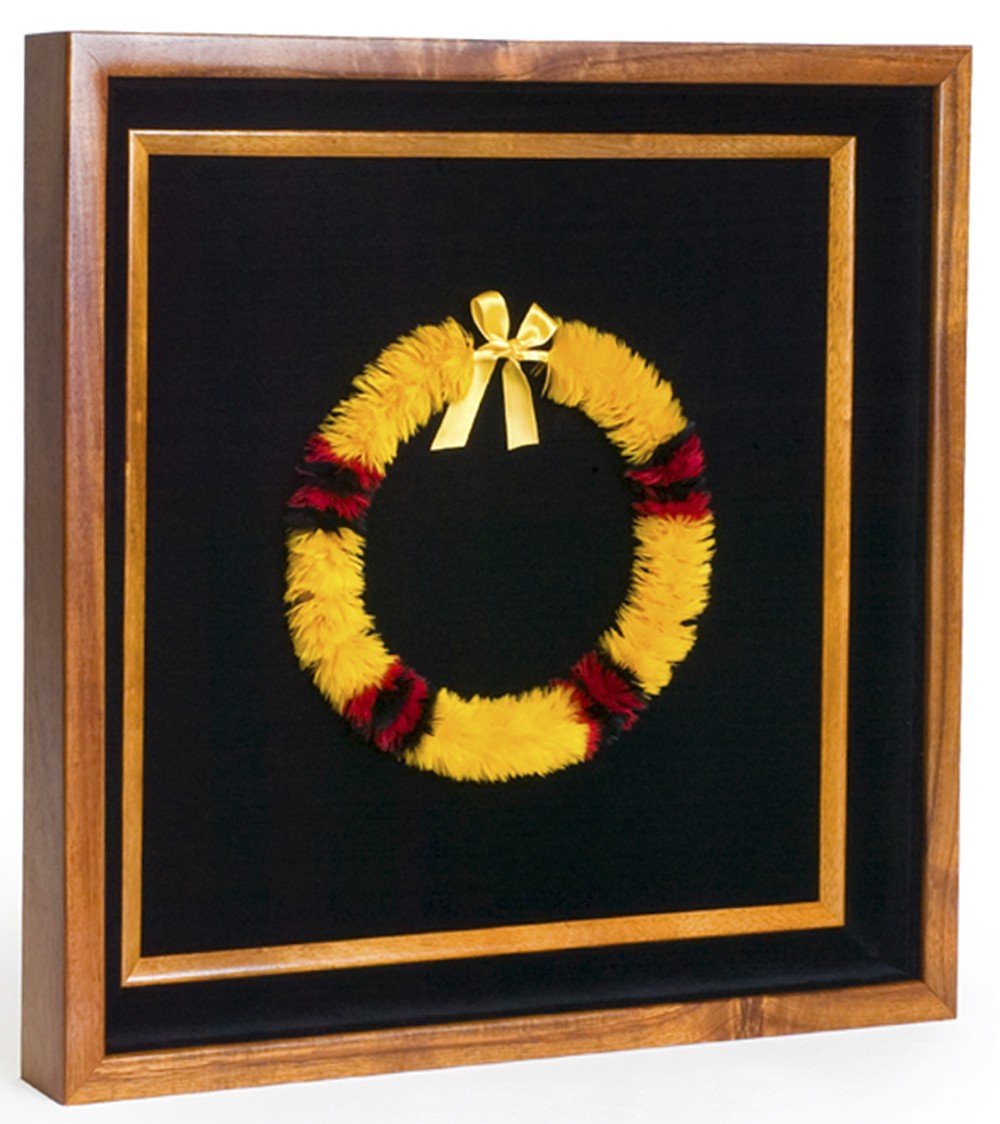 Framed in Koa shadow boxes by Martin & MacArthur. These feather lei are perfect for a home or office setting. Allow 6-8 weeks for production if not in stock.