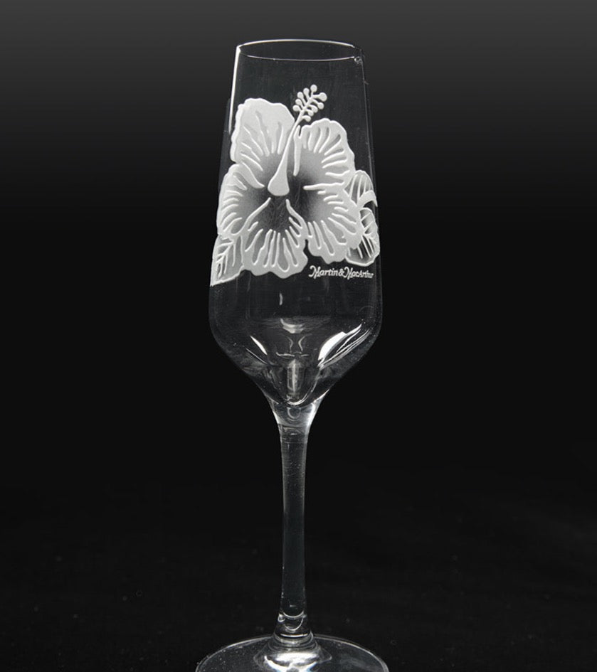 Martin & MacArthur craftsmen partner with glass artist Rolf to create distinctive, sand-etched glasses with designs of Hawaiian Plumeria, Hibiscus and Bird of Paradise.