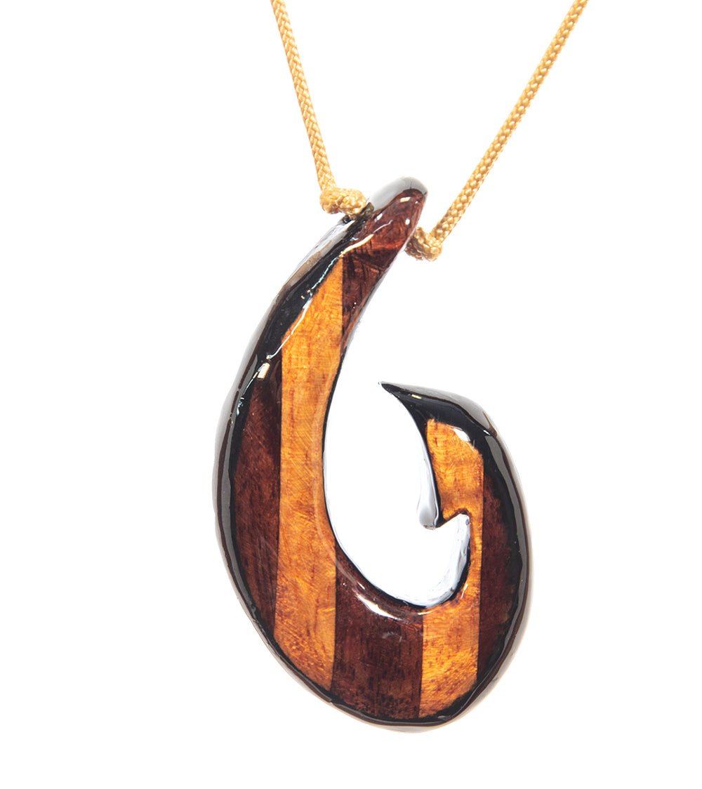 Hawaiian craftsman Dewey Medeiros creates stunning fish hook pendants with Hawaiian hard woods such as curly Koa, padauk and purple heart.