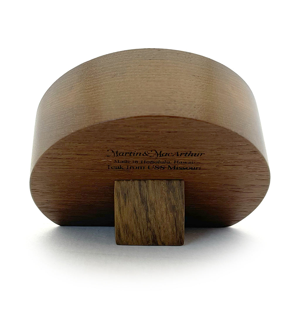 This solid Teak Ship’s Clock is made from the original teak deck of the USS Missouri battleship. It was hand-made by Martin & MacArthur craftsmen to honor the legacy of Mighty Mo. Perfect for any office or home, this Teak Ship's Clock will be a reminder of courage and honor for years to come.