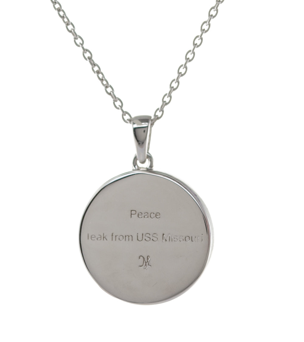 A new era of world peace began with the signing of the Japanese surrender on the Teak deck of the USS Missouri on September 2, 1945. General Douglas MacArthur and Admiral Chester Nimitz represented the United States on this auspicious occasion. Martin & MacArthur craftsmen create the Dove of Peace pendant using Teak wood from the original deck of the USS Missouri on which General MacArthur stood. Each Teak pendant is made with honor and respect for the military heroes who served in World War II and fought for world peace.