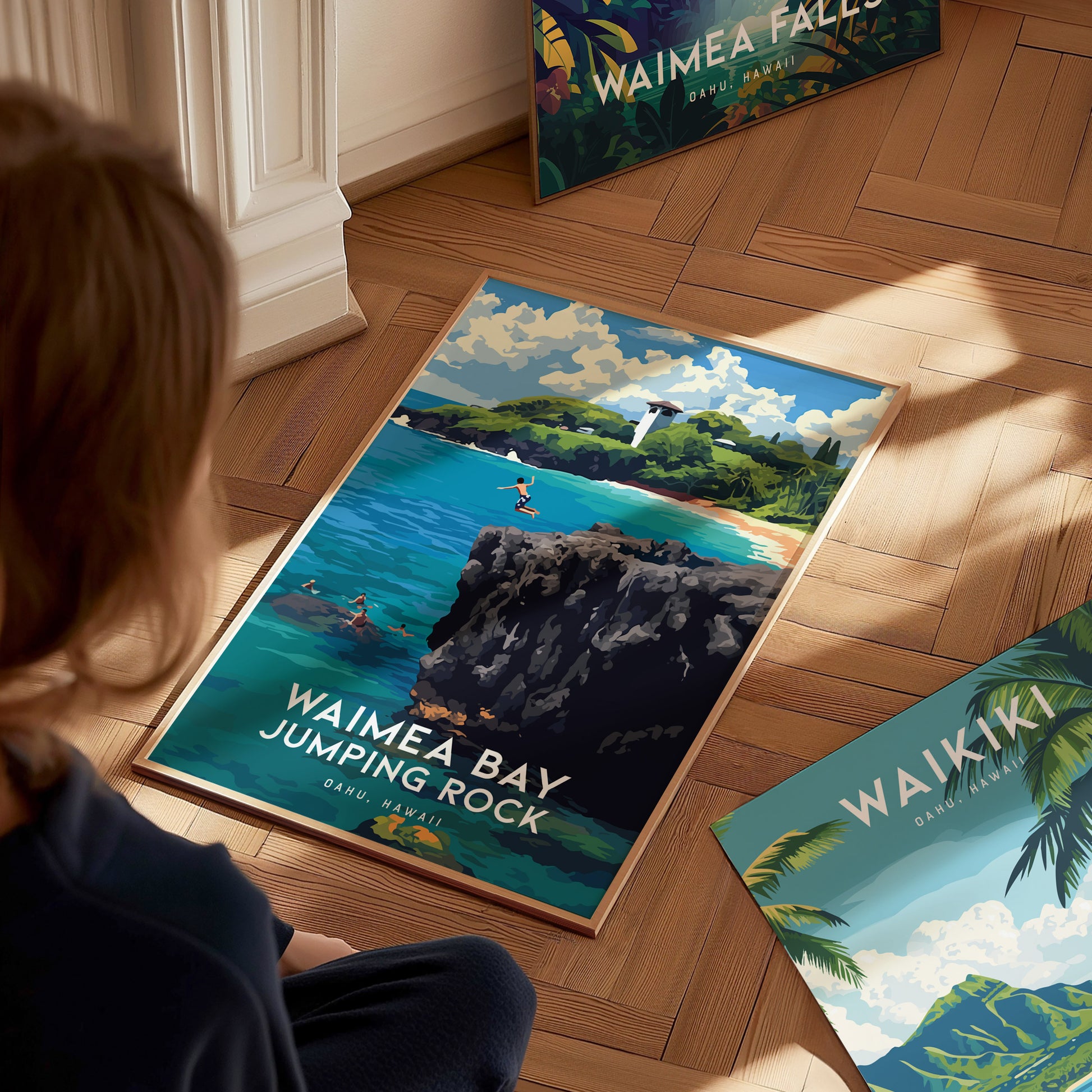 Capture the thrill and beauty of Waimea Bay’s Jumping Rock, a legendary North Shore landmark where locals and visitors alike take the plunge into crystal-clear Hawaiian waters. This vibrant art print showcases the exhilaration of cliff jumping, framed by the stunning backdrop of Waimea’s turquoise bay, golden sands, and lush greenery.